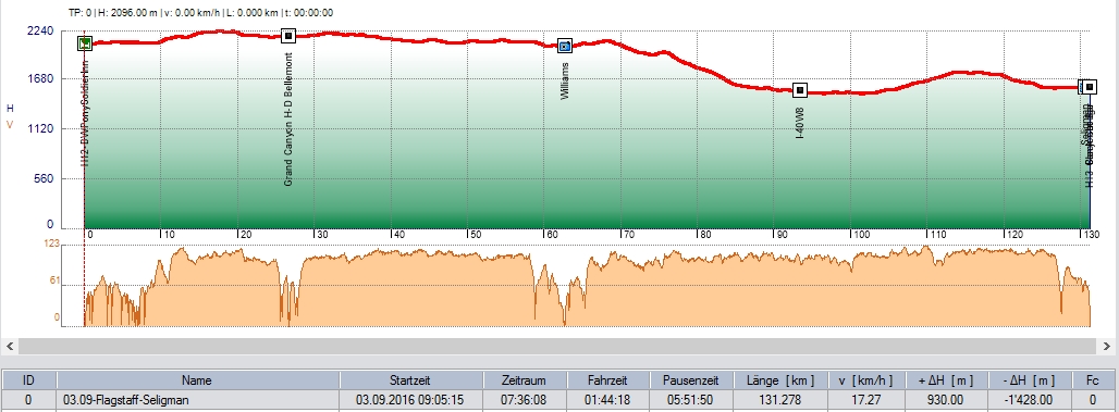 Heute war ich der, der es nötig hatte nach dem Frühstück und Gepäck laden noch einmal in die Horizontale zu gehen. Während die Gruppe zum Grand Canyon fuhr ging ich es sehr gemütlich an und fuhr erst gegen Mittag los um in Williams wieder zur Gruppe zu stossen.