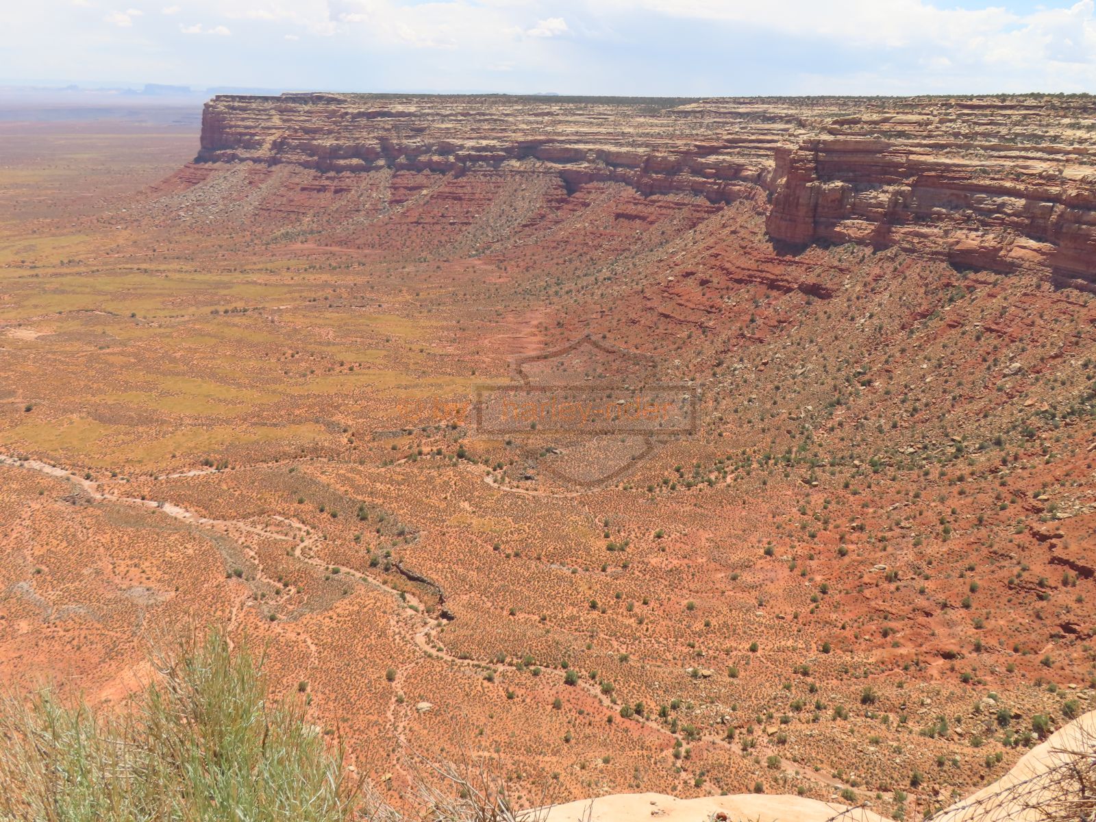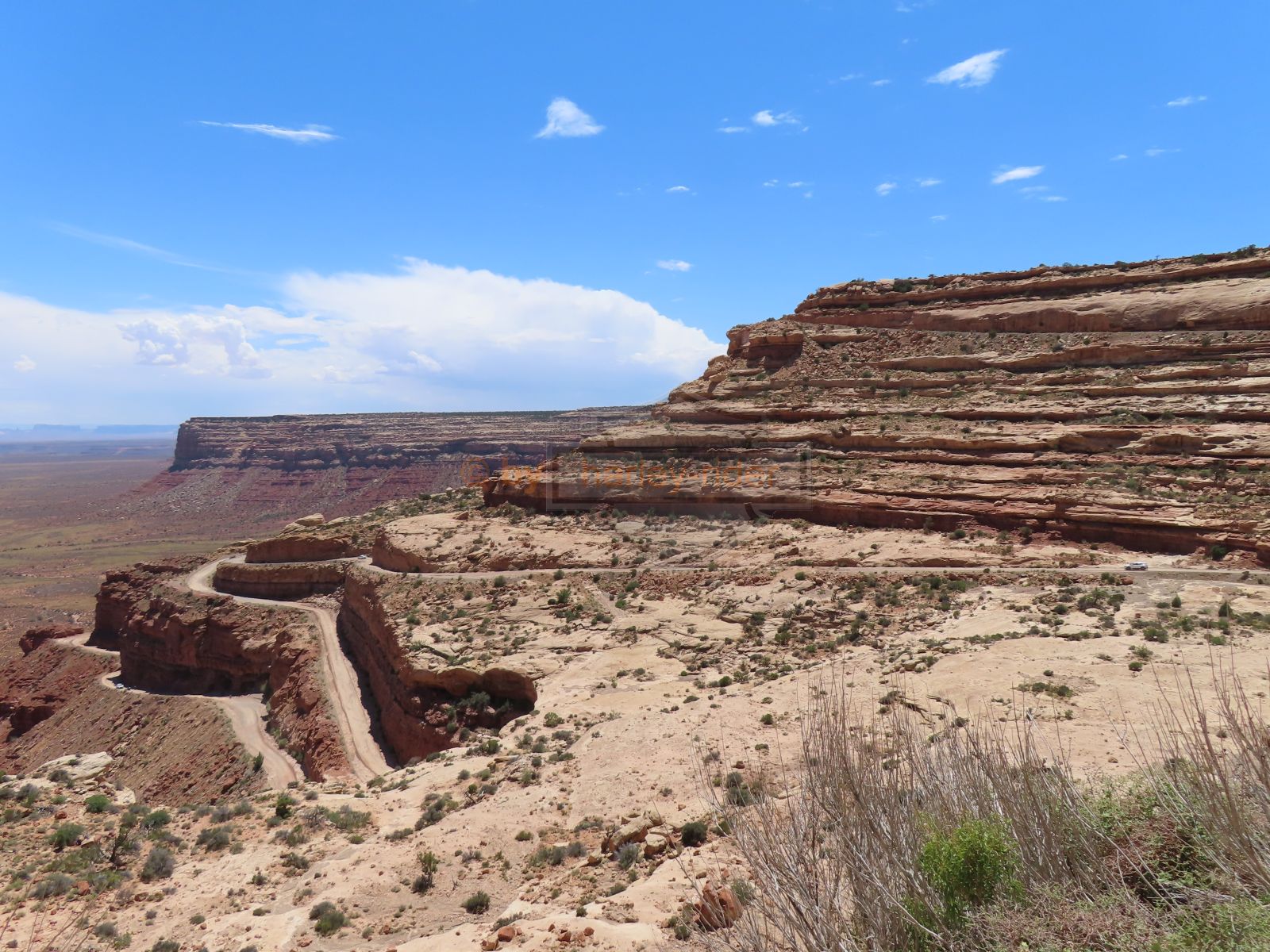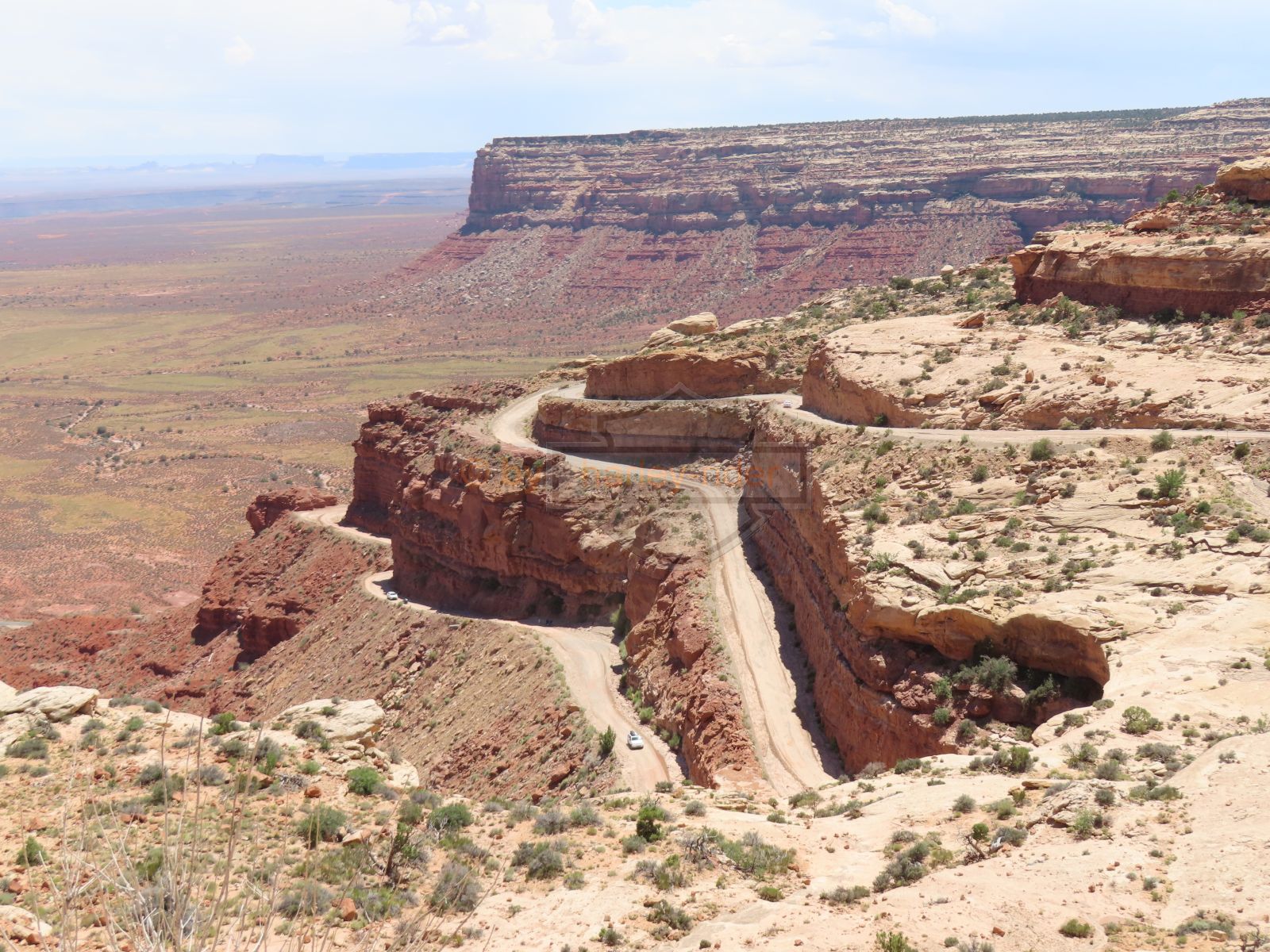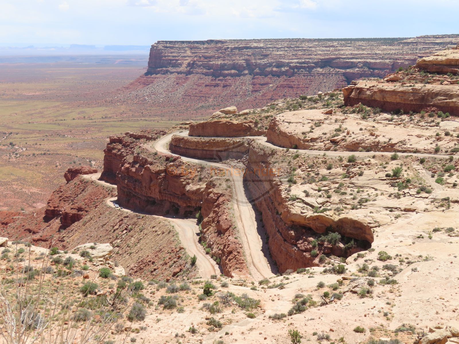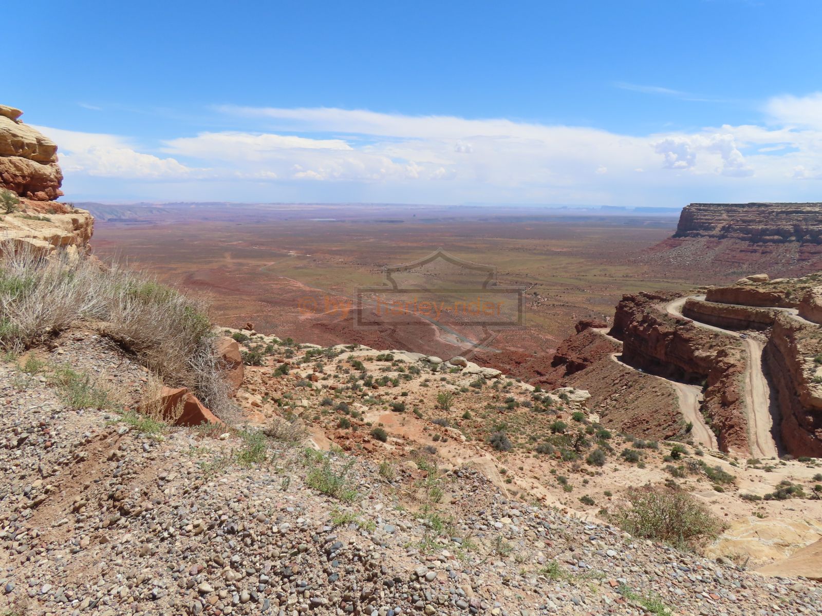 Den Moki Dugway bin ich schon vor über 20 Jahren mit meiner Jubiläums Ultra gefahren und habe diese Gravel Road doch in einem massiven besseren Zustand in Erinnerung. Ich musste zum Teil mit dem Jeep den besten Pfad durch das, auf die Strasse geschwemmte, Geröll suchen und hätte hier aktuell nicht mit einer Harley hochfahren wollen.