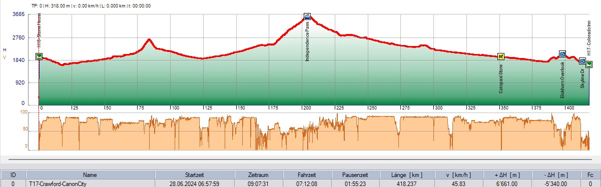 Eine lange Tagesetappe mit über 400km stand heute vor mir. Es wurd eine recht uninteressante eintönige Fahrt, obwohl auch die höchste befahrbare Passtrasse, der Indipendencepass, mit dabei war. Die Passtrasse führt grösstenteils durch den Wald und es gibt erst auf den obersten paar Höhenmetern was zu sehen.