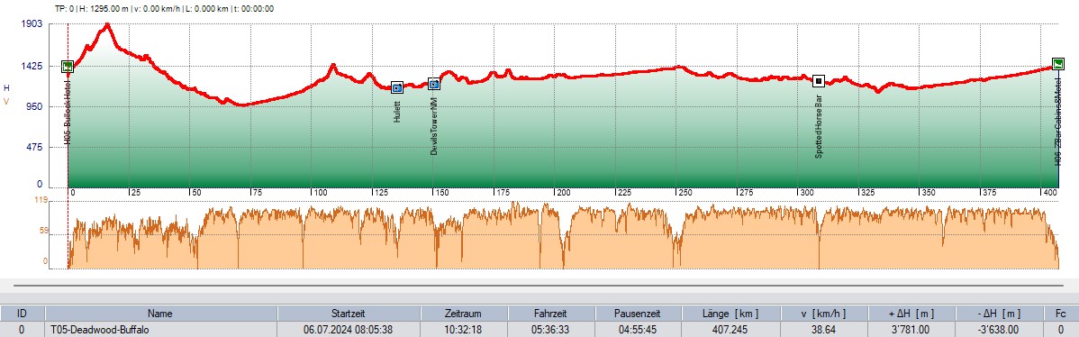 Die heutige Tagesetappe führt uns über den Spearfish Canyon zum sagenumwobenen Devils Tower, einem 264 Meter hohen Basaltmonolith. Gut möglich, dass heute ein paar von uns im „Bordello“ übernachten werden.....