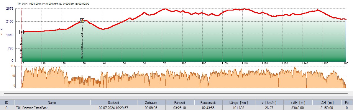 Übernahme der Bikes und Fahrt über den fantastischen „Peak to Peak Scenic Byway“. Uns erwartet eine gespenstische Nacht!