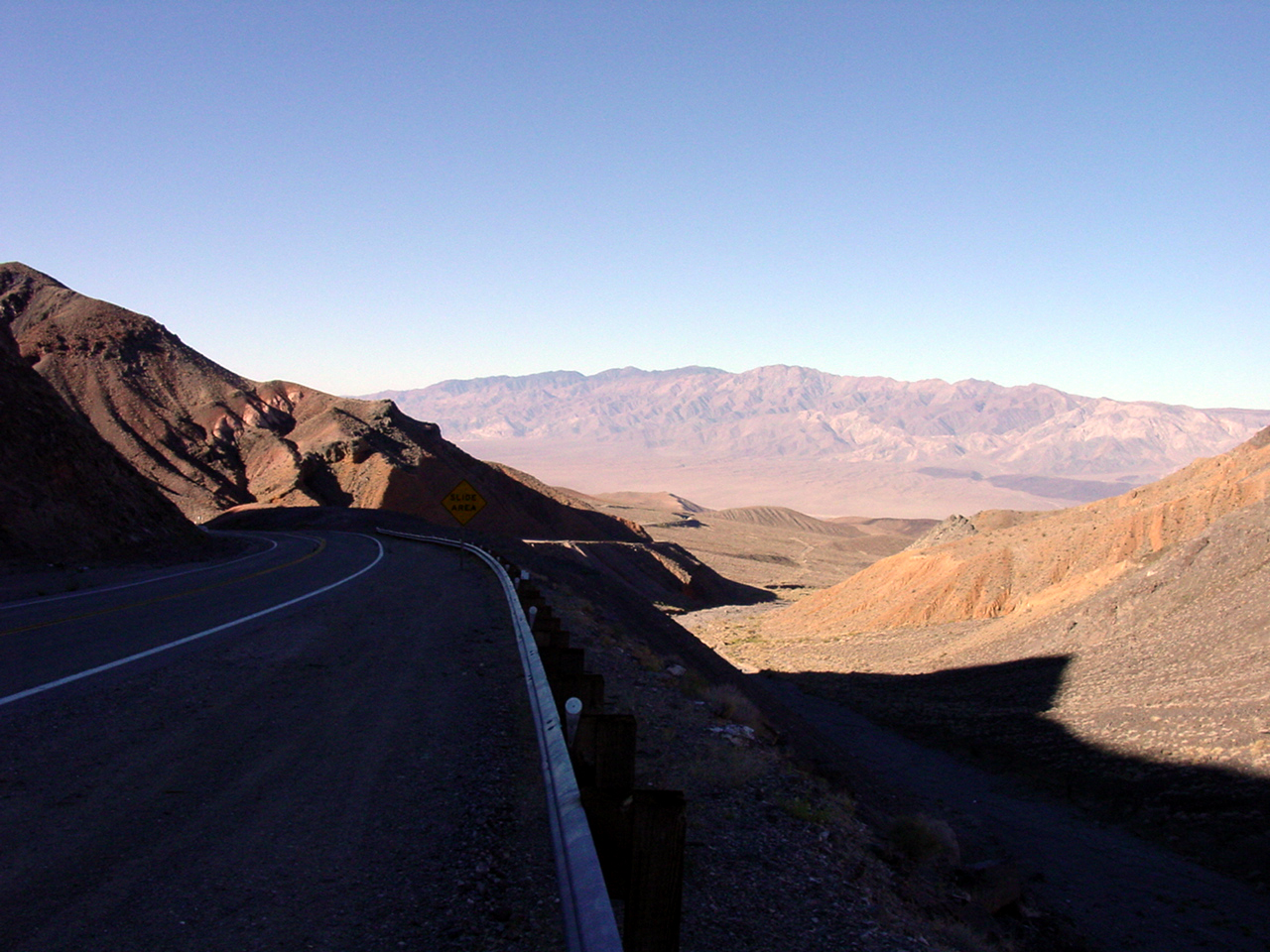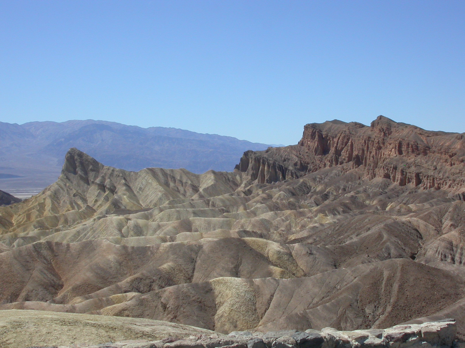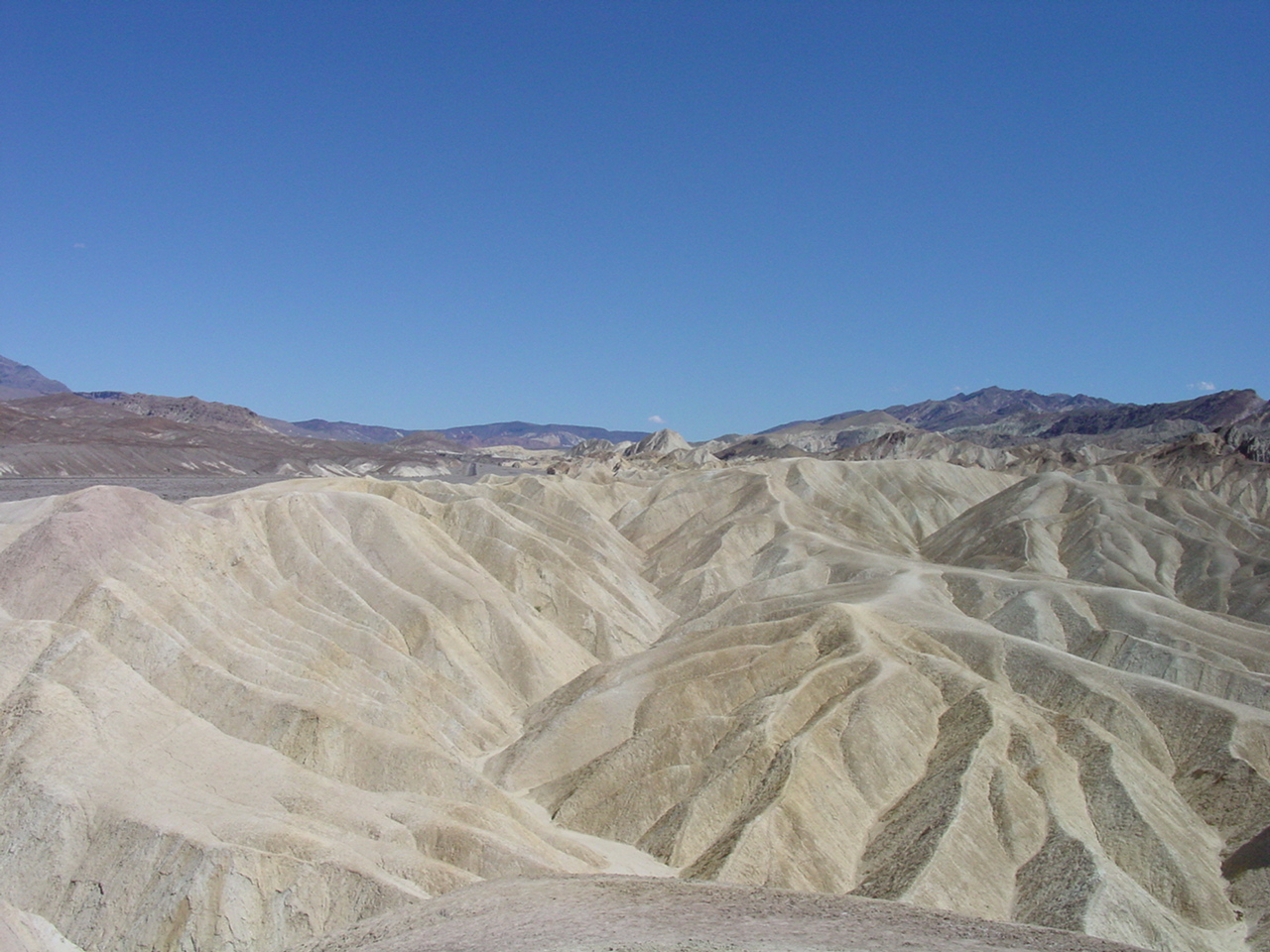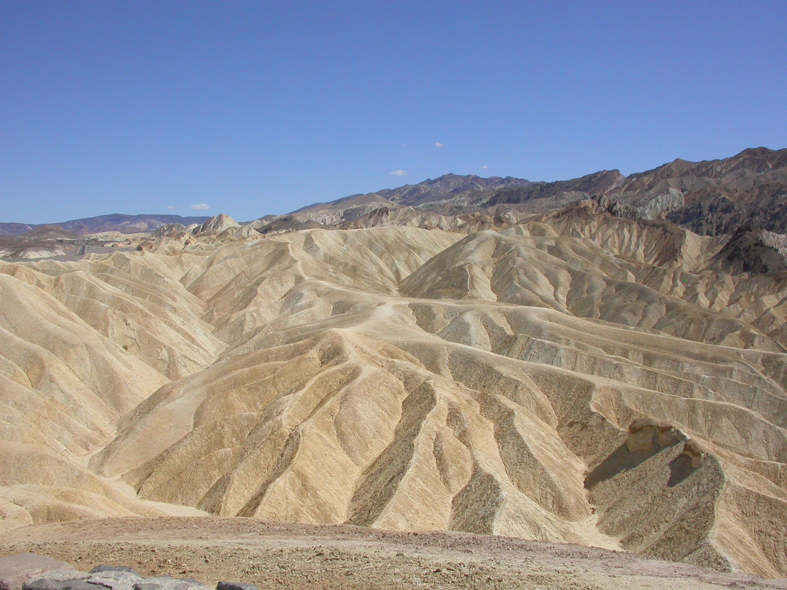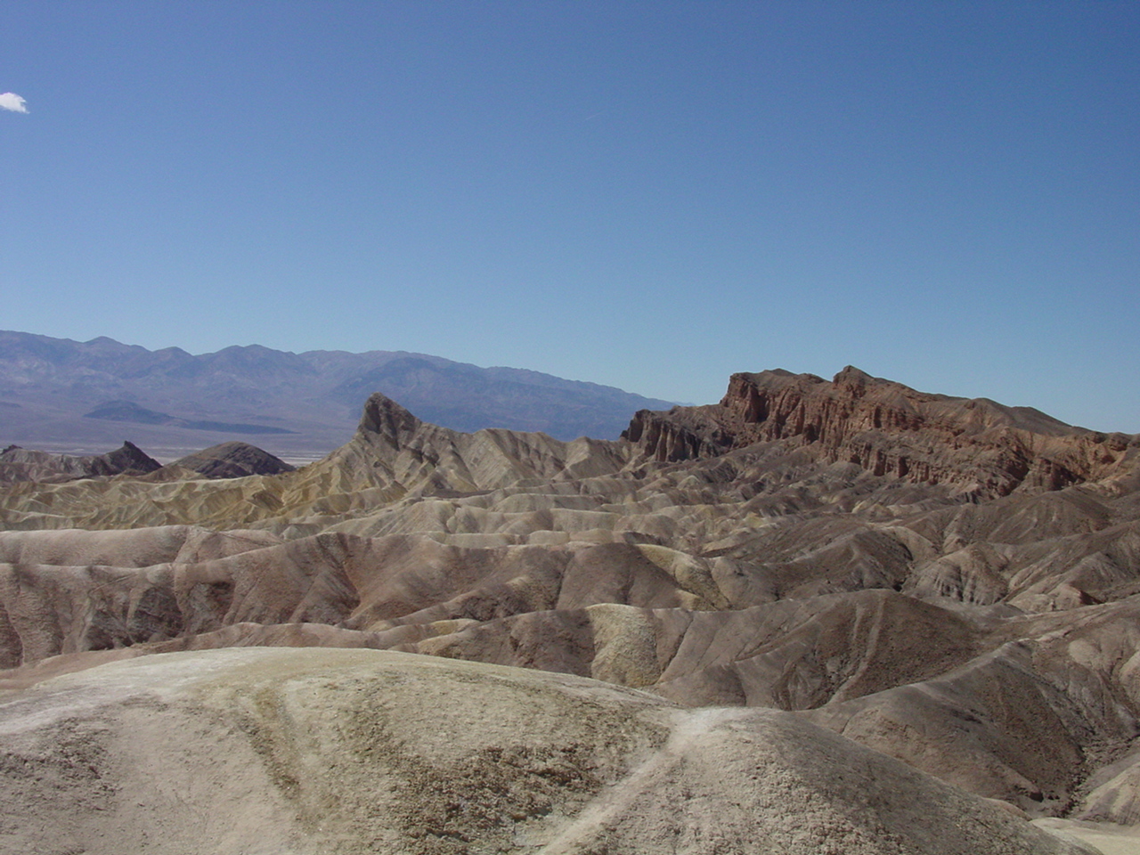 Die Lichterwüste Las Vegas verliessen wir durch den Red Rock Canyon um in die richtige Wüste, in das Tal des Todes zu gelangen. Versorgt mit reichlich Mineralwasser fuhren wir zum ersten Aussichtpunkt 'Dantes View' auf 1669 MüM. Von hier oben hat man eine imposanten Überblick über das Death Valley und hinunter in die flimmernde Hitze. Auf dieser Höhe war es noch angenehm Frisch, doch mit jedem Meter, den wir weiter in das Tal hinunterfuhren wurde es heisser.