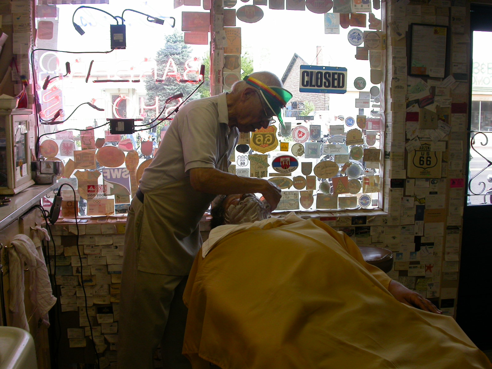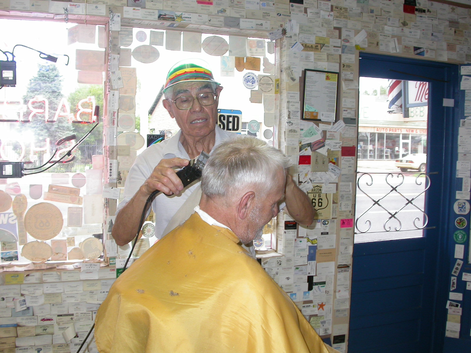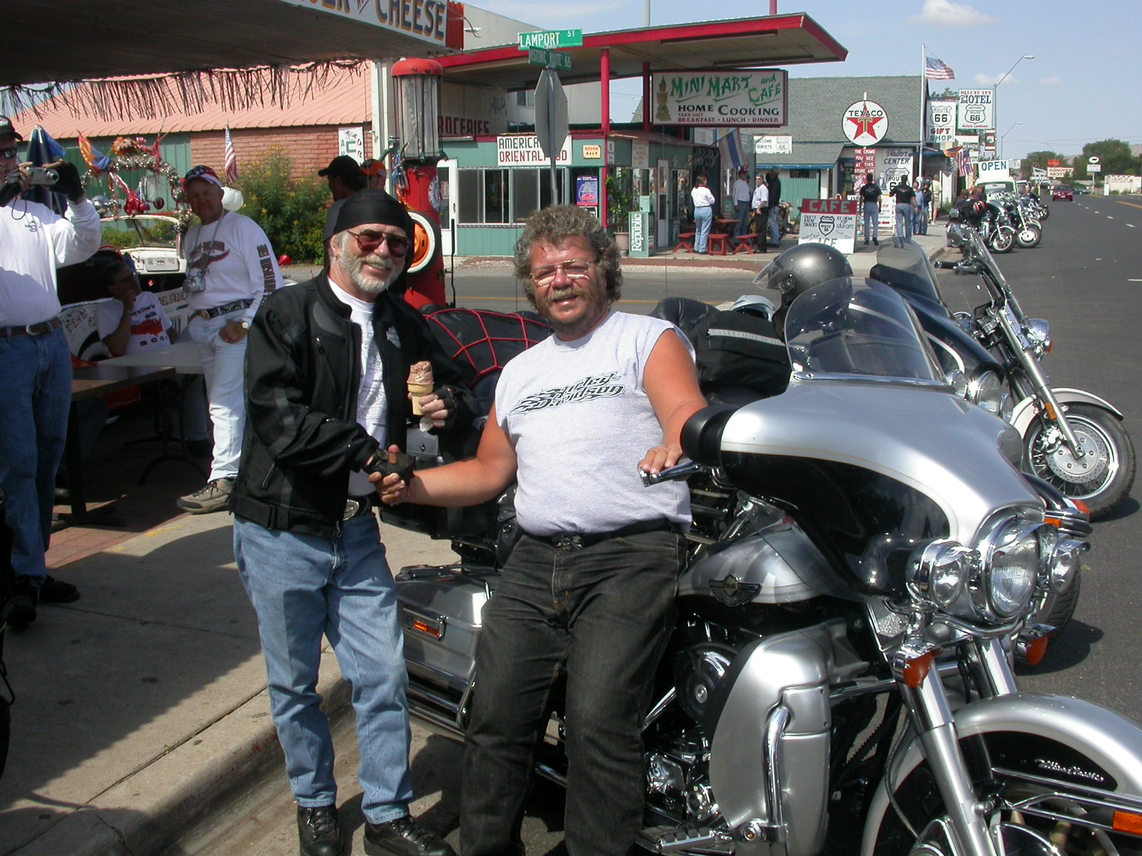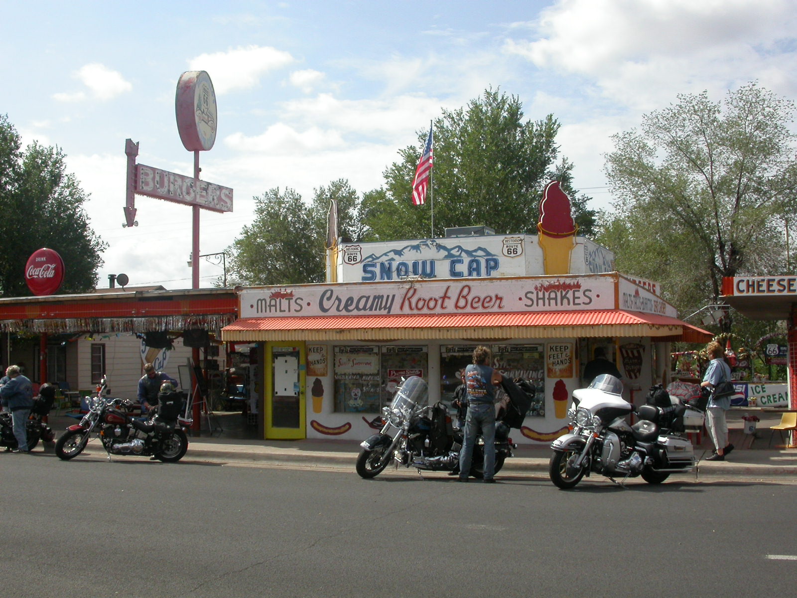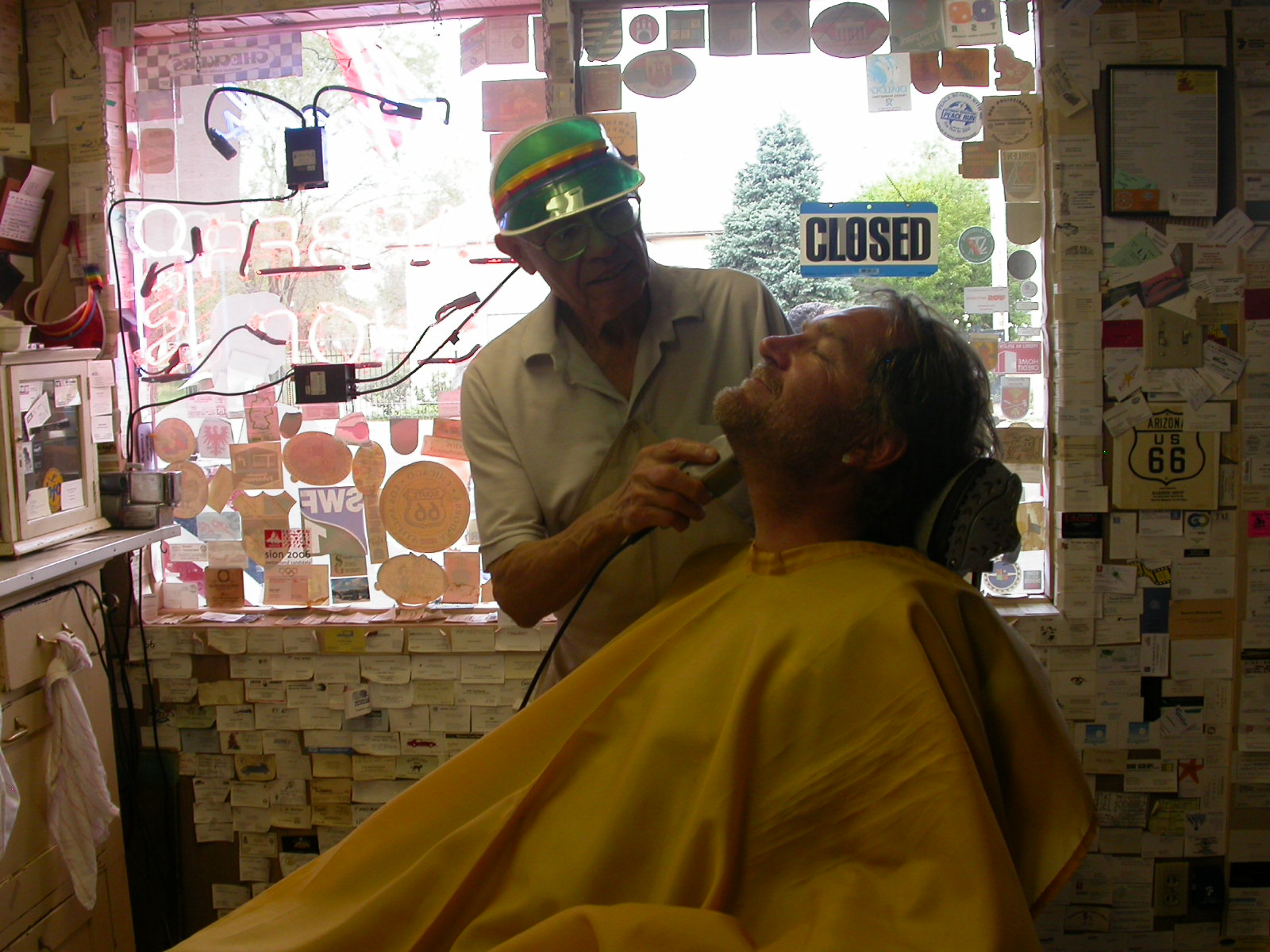 In Seligman biegt die Route 66 von der Interstate ab und hier ist das längste noch erhaltene Teilstück zu befahren. Doch bevor man dieses Teilstück befährt lohnt sich ein Halt bei den Gebrüder Delgadillo, den 'Rettern' der Route 66 in Arizona. In Juan's Snow Cap Drive-In kann man sich Verpflegen, doch Vorsicht vor seinen Spässen. Im Barber- und Gift Shop von Angel gibt's Souveniers und er beseitigt auf Wunsch auch den wilden Bart- und Haarwuchs. Diese Gelegenheit liessen wir uns nicht nehmen und nahmen auf dem Barbierstuhl für eine Behandlung Platz. Plötzlich gab es eine grosse Aufregung und ein ganzer Pulk Harleys fuhr vor den Lokalen auf. Darunter war auch Willy G. Davidson mit seiner Familie. Sie waren auf dem 'Ride Home', der Sternfahrt zu Harleys 100tem Geburtstag. Wir kamen mit ihnen in Kontakt und es war ganz interessant mal mit den Fabrikbesitzern direkt zu sprechen.