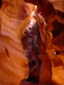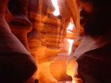 Vor der Weiterfahrt nach Flagstaff, wo wir wieder auf die 'Old Route 66' treffen sollten, besuchten wir noch eine weitere Sehenswürdigkeit der Navajo Indianer, den Antelope Canyon. Diese schmale Schlucht bietet je nach Tageszeit und Sonneneinfall ein Farbenspiel sondergleichen an den Felswänden. Der Canyon ist heute noch im Besitz der Indianer und ein indianisches Kulturgut, dass ihnen nicht von den 'Weissen' gestohlen wurde. Er wurde vor Jahren von einem indianischen Hirtenmädchen entdeckt und dient heute als touristische Einnahmequelle. Die Besichtigung wird zu Fuss gemacht und durch den Canyon hindurch ist es meistens nur gerade Schulterbreit.