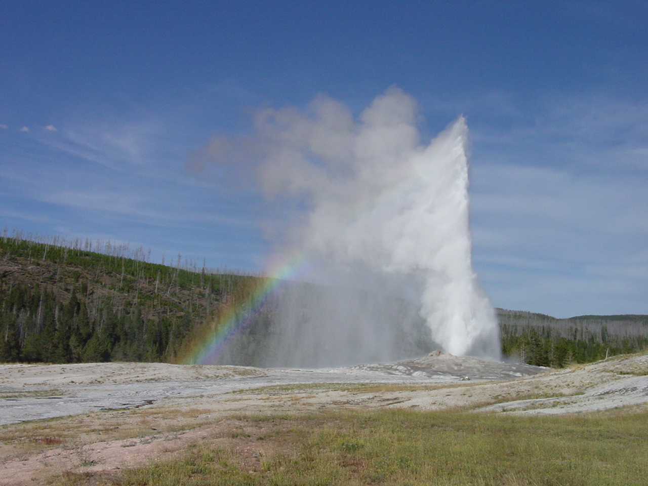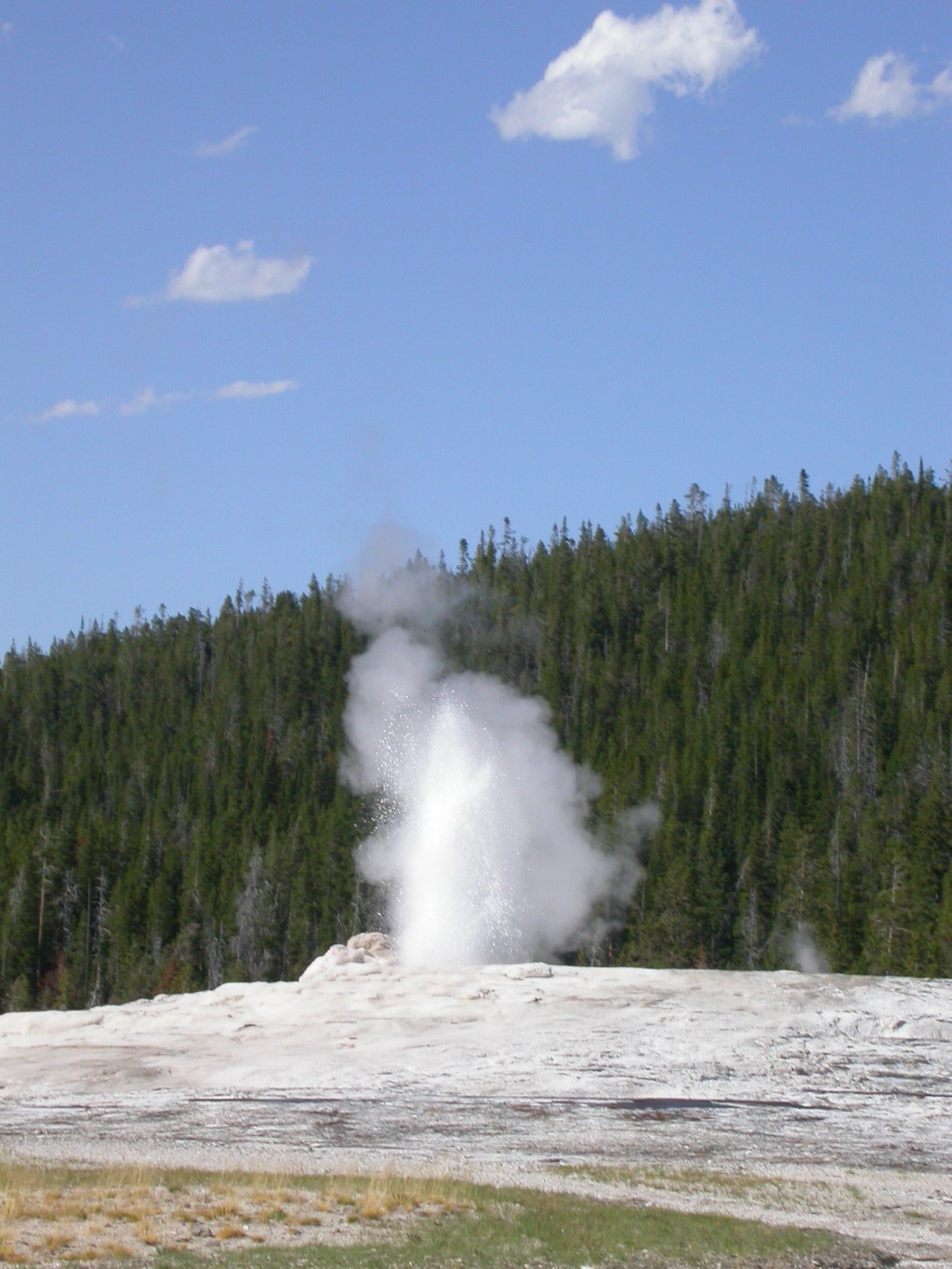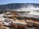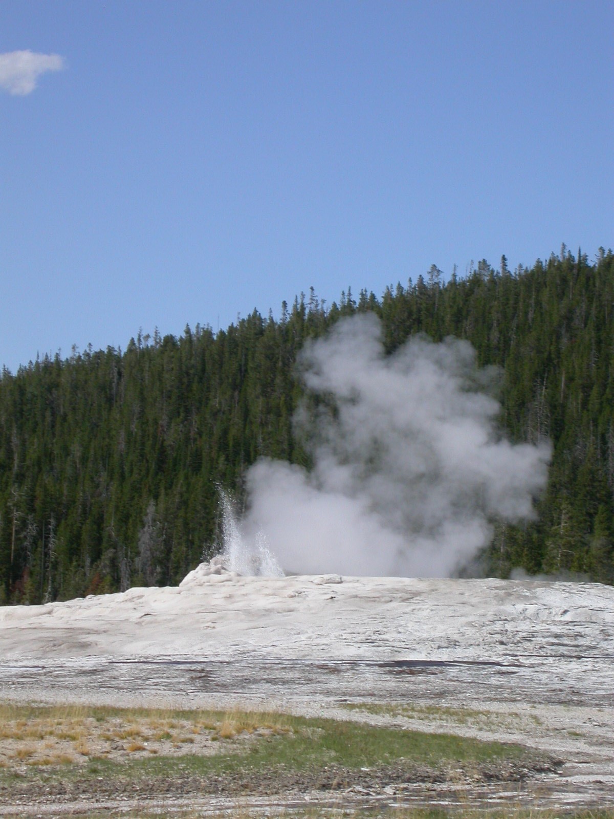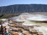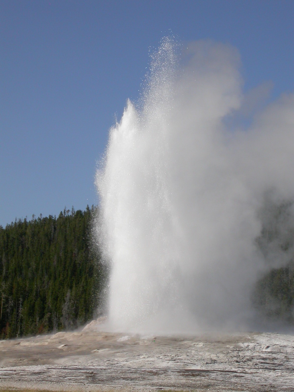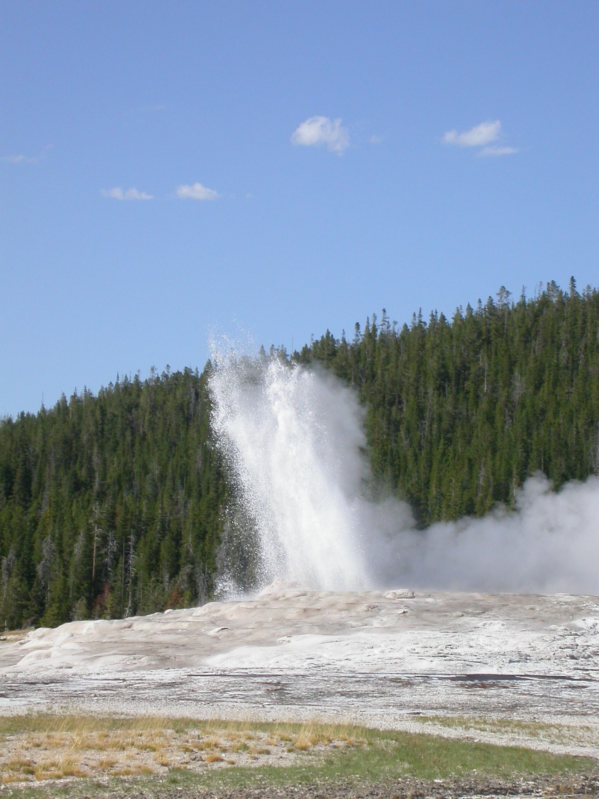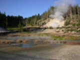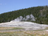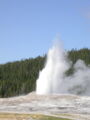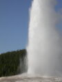 Hier im Yellowstone Nationalpark war Natur pur angesagt. Auf der grossen Rundfahrt (ca. 220 km) werden dem Besucher unvergessliche Bilder geboten. Wilde Tiere wie Bisons, Hirsche, Bären, etc. über die heissen vulkanischen Quellen mit den farbenprächtigen Steinablagerungen bis zum aktiven Old Faithful Geisyr. Dieser schiesst im Stundenrhytmus seine Fontäne in die Höhe, wobei er es dabei recht spannend macht. Das ganze Spektakel dauert ca. eine viertel stunde und jedesmal wenn er ein bisschen 'hustet', meint der Zuschauer es geht los und schiesst Foto um Foto, bis er sich nach zahlreichen 'Fehlalarmen' endlich in die Höhe ergiesst.