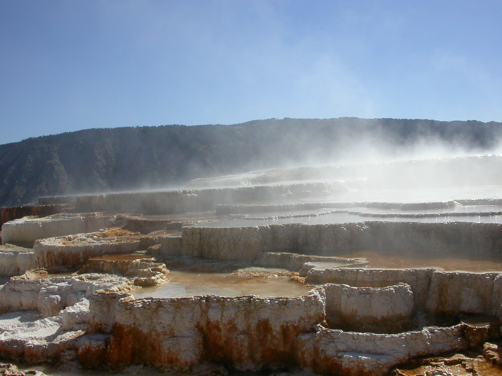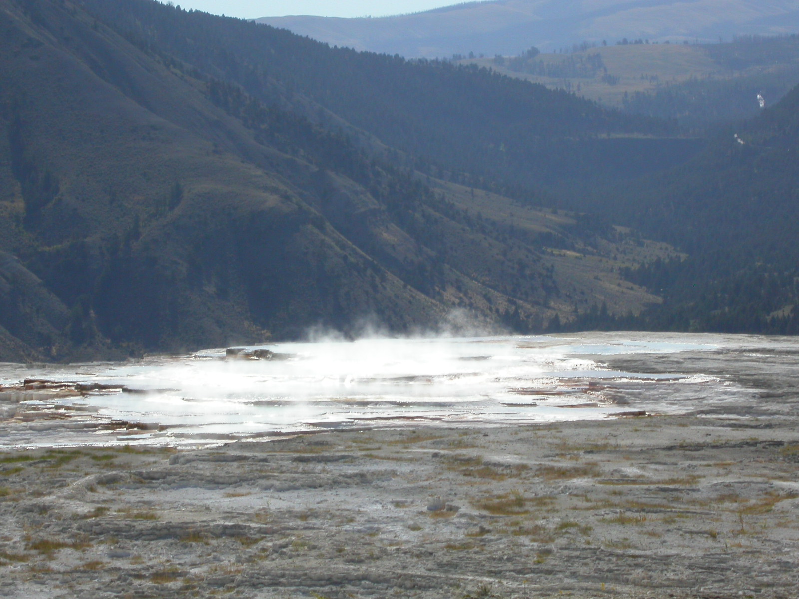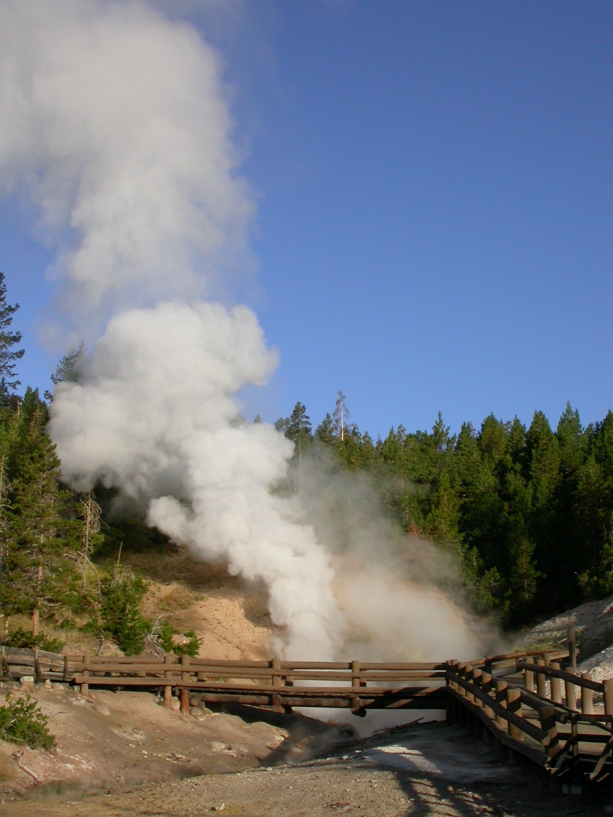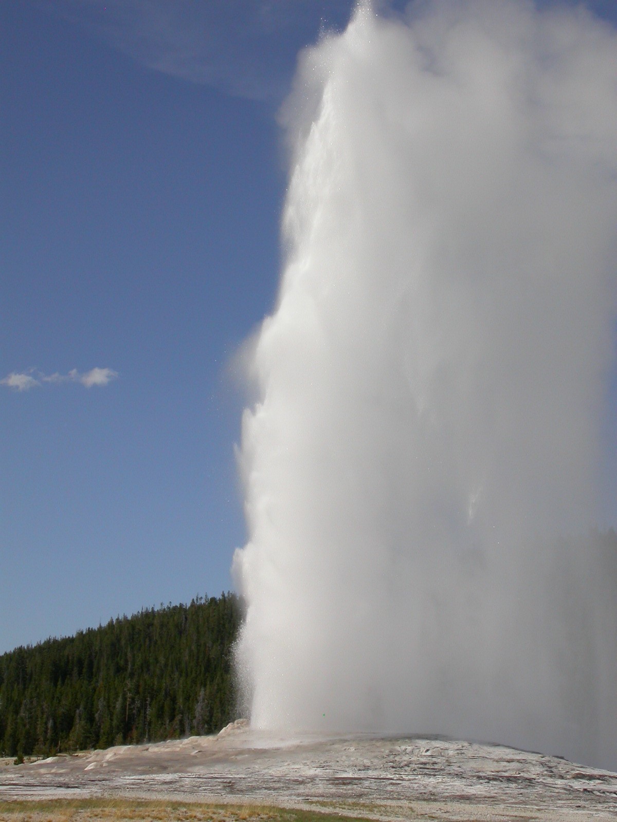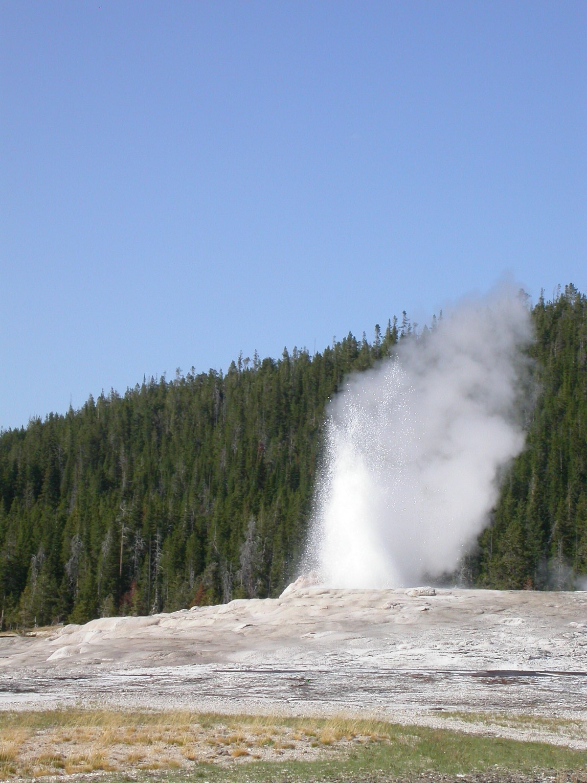 Hier im Yellowstone Nationalpark war Natur pur angesagt. Auf der grossen Rundfahrt (ca. 220 km) werden dem Besucher unvergessliche Bilder geboten. Wilde Tiere wie Bisons, Hirsche, Bären, etc. über die heissen vulkanischen Quellen mit den farbenprächtigen Steinablagerungen bis zum aktiven Old Faithful Geisyr. Dieser schiesst im Stundenrhytmus seine Fontäne in die Höhe, wobei er es dabei recht spannend macht. Das ganze Spektakel dauert ca. eine viertel stunde und jedesmal wenn er ein bisschen 'hustet', meint der Zuschauer es geht los und schiesst Foto um Foto, bis er sich nach zahlreichen 'Fehlalarmen' endlich in die Höhe ergiesst.