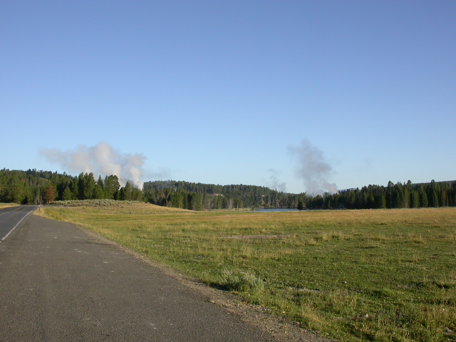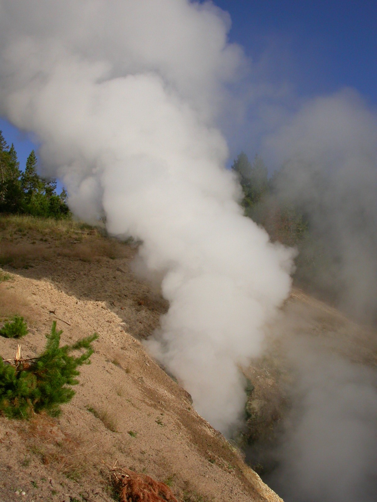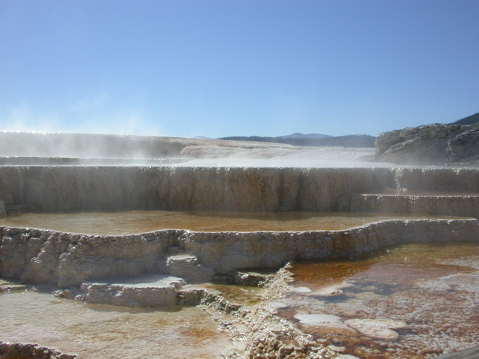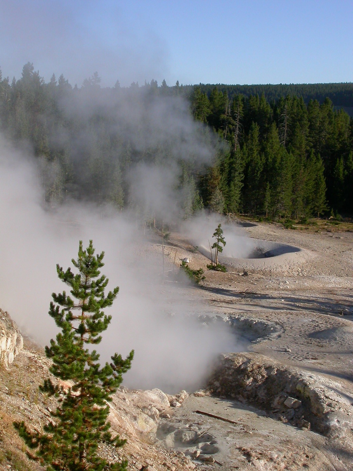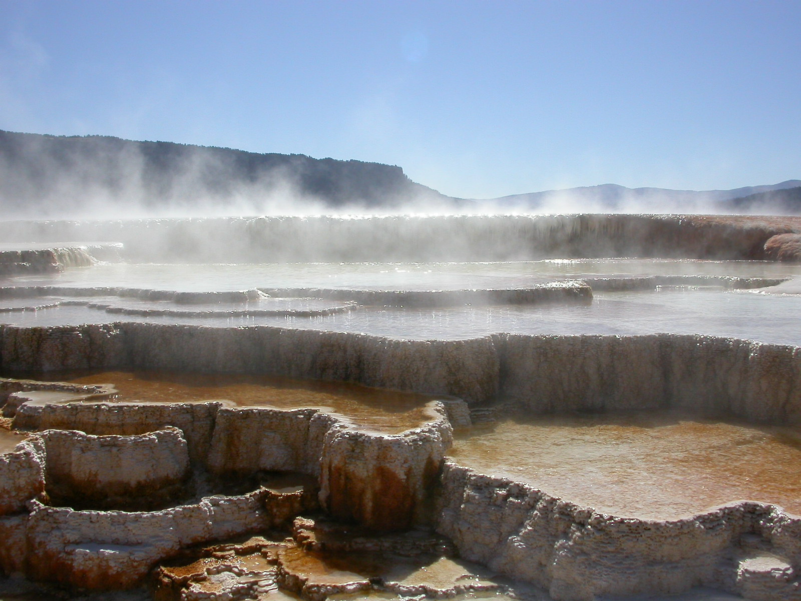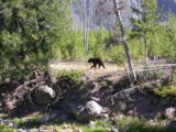 Hier im Yellowstone Nationalpark war Natur pur angesagt. Auf der grossen Rundfahrt (ca. 220 km) werden dem Besucher unvergessliche Bilder geboten. Wilde Tiere wie Bisons, Hirsche, Bären, etc. über die heissen vulkanischen Quellen mit den farbenprächtigen Steinablagerungen bis zum aktiven Old Faithful Geisyr. Dieser schiesst im Stundenrhytmus seine Fontäne in die Höhe, wobei er es dabei recht spannend macht. Das ganze Spektakel dauert ca. eine viertel stunde und jedesmal wenn er ein bisschen 'hustet', meint der Zuschauer es geht los und schiesst Foto um Foto, bis er sich nach zahlreichen 'Fehlalarmen' endlich in die Höhe ergiesst.