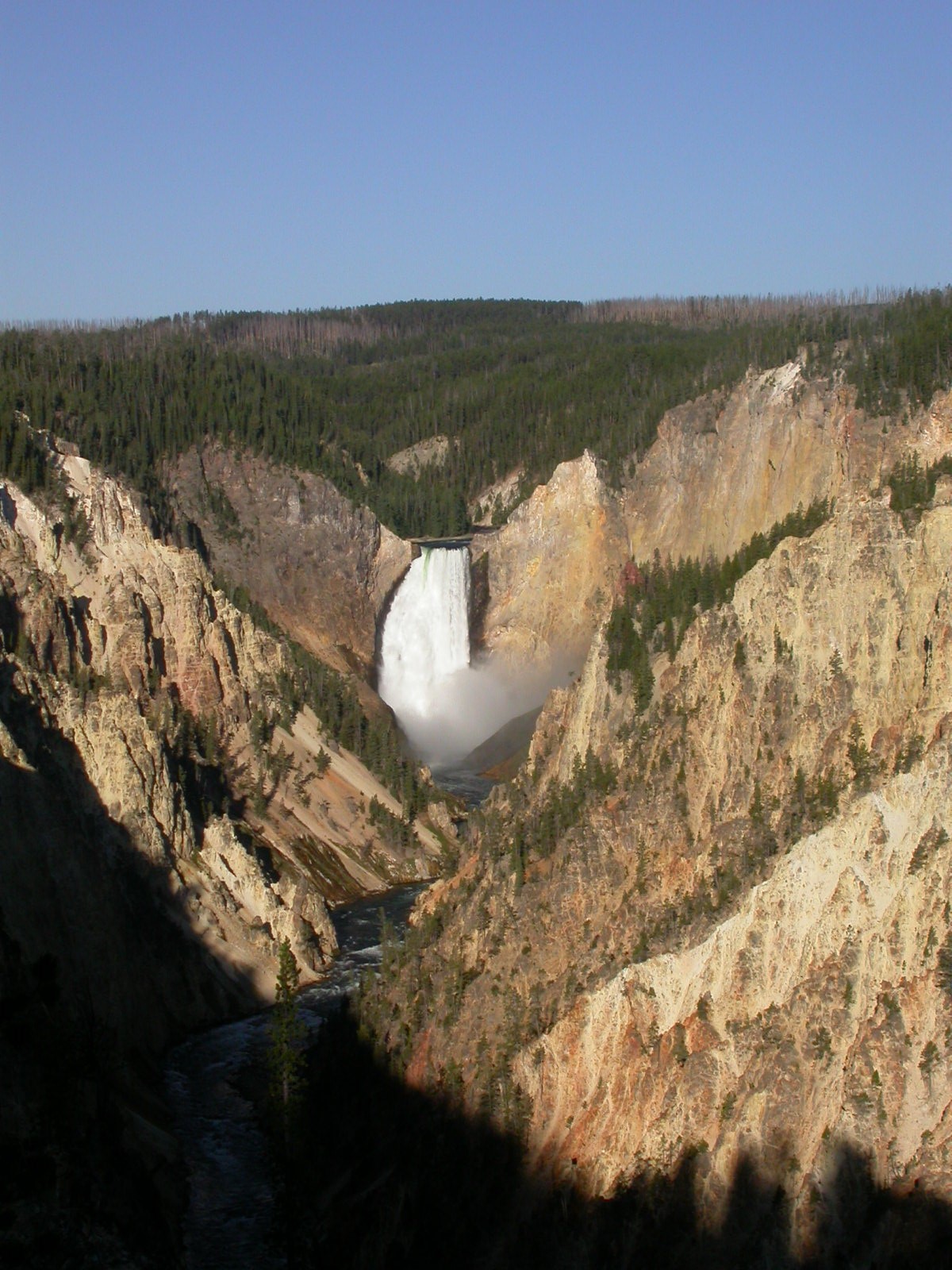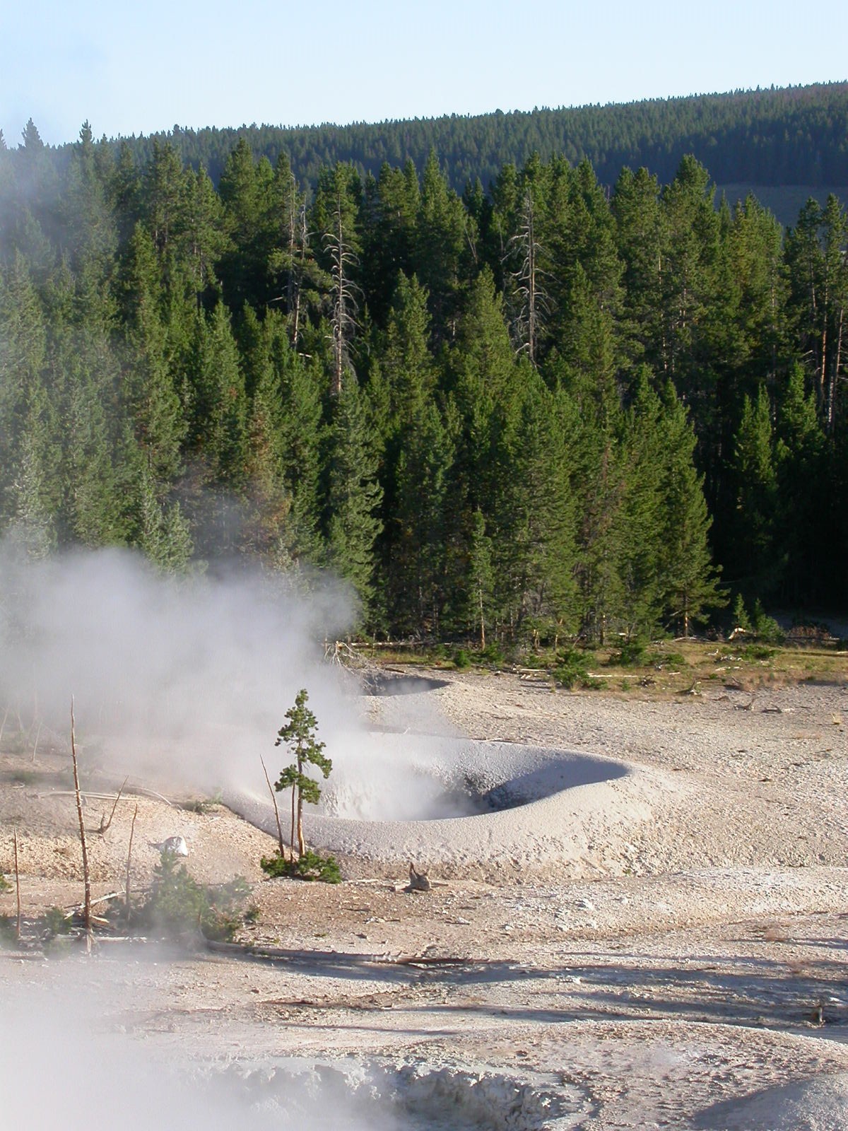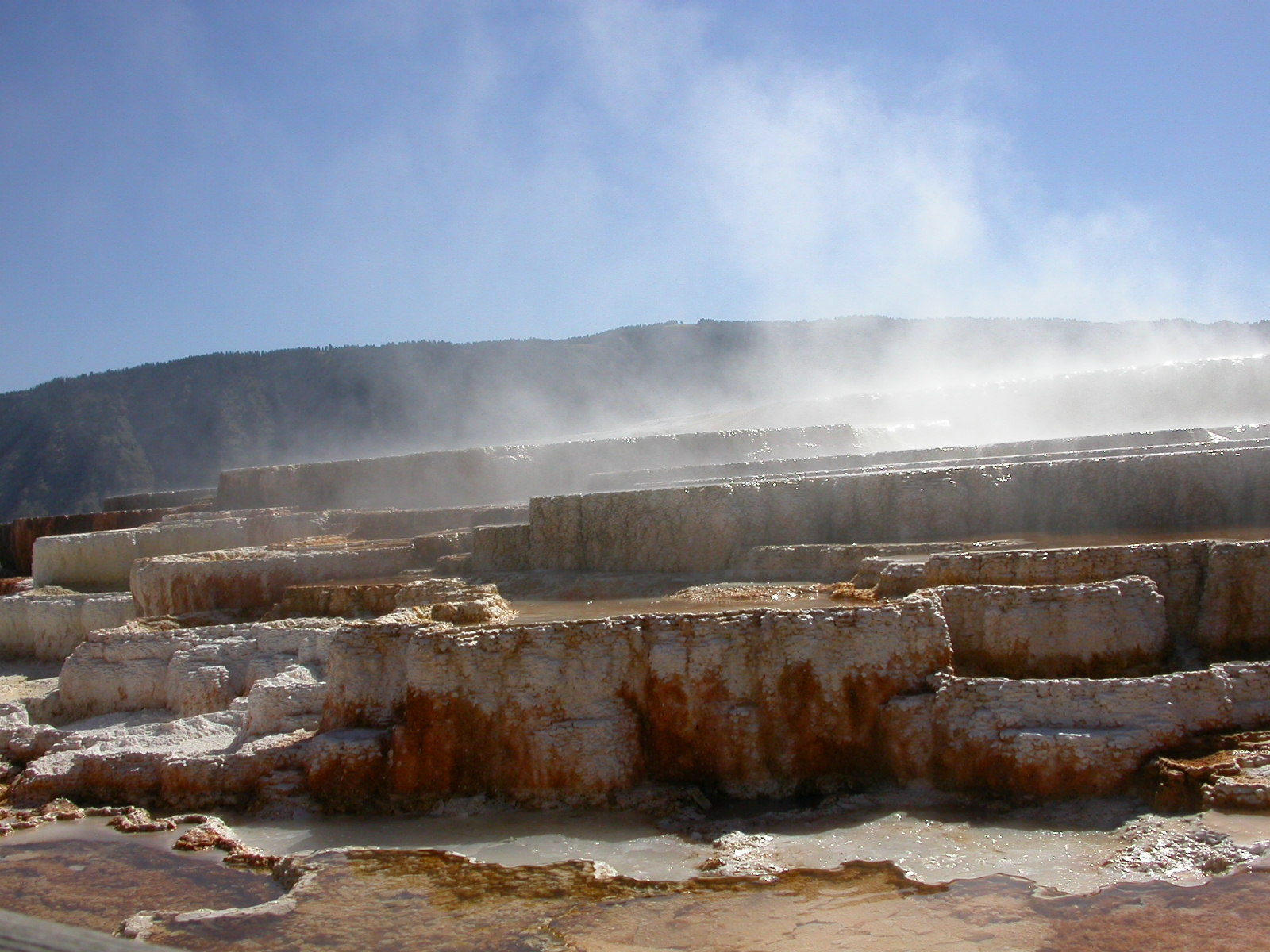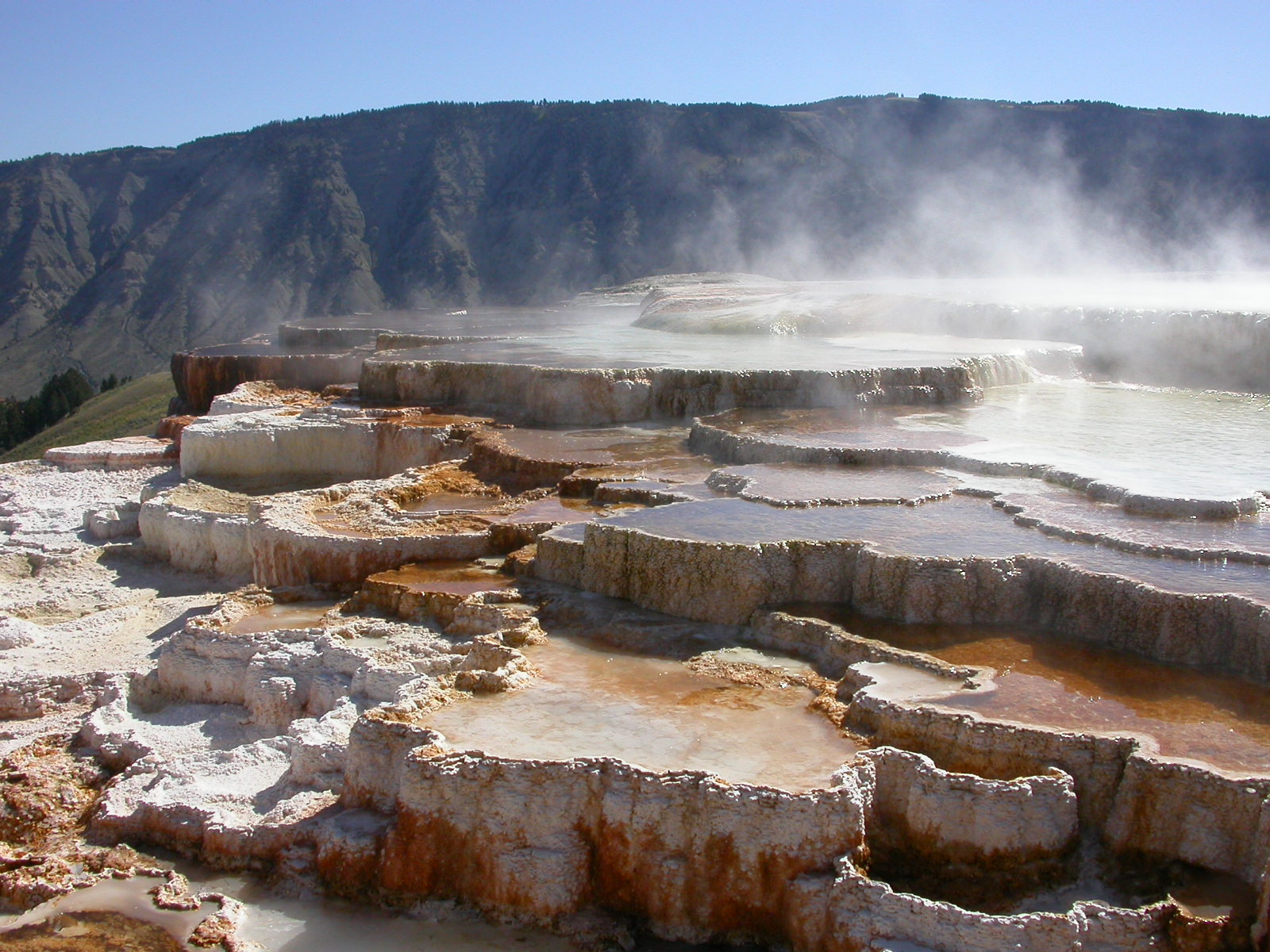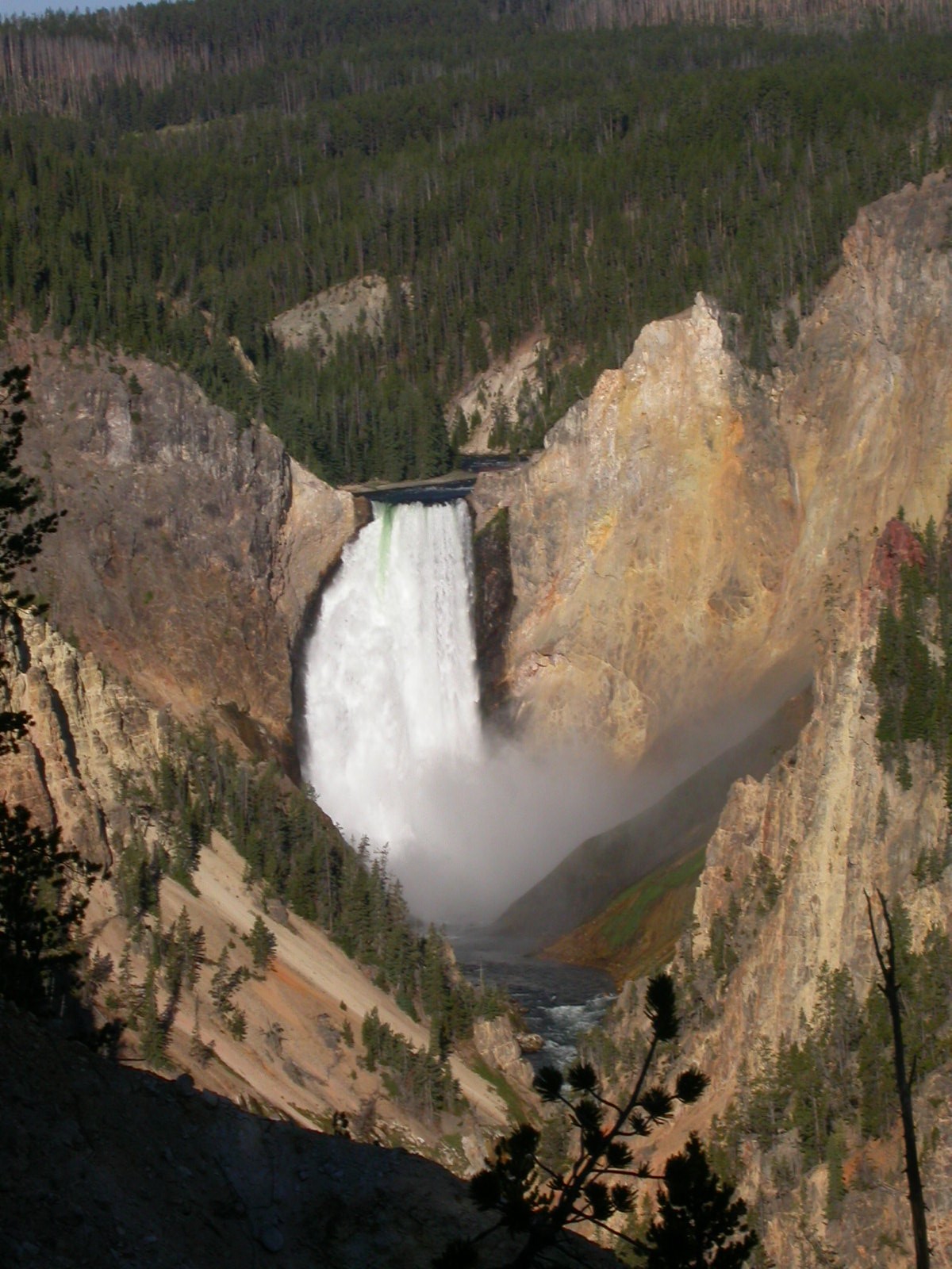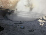 Hier im Yellowstone Nationalpark war Natur pur angesagt. Auf der grossen Rundfahrt (ca. 220 km) werden dem Besucher unvergessliche Bilder geboten. Wilde Tiere wie Bisons, Hirsche, Bären, etc. über die heissen vulkanischen Quellen mit den farbenprächtigen Steinablagerungen bis zum aktiven Old Faithful Geisyr. Dieser schiesst im Stundenrhytmus seine Fontäne in die Höhe, wobei er es dabei recht spannend macht. Das ganze Spektakel dauert ca. eine viertel stunde und jedesmal wenn er ein bisschen 'hustet', meint der Zuschauer es geht los und schiesst Foto um Foto, bis er sich nach zahlreichen 'Fehlalarmen' endlich in die Höhe ergiesst.