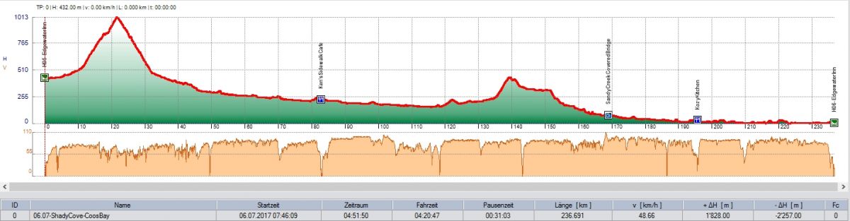 Heute haben wir eine kürzere Etappe, entlang des Umpqua-, dem Coquille River und durch Hügel, auf kurvigen Strassen fahrend, treffen wir am frühen Nachmittag in Coos Bay ein.