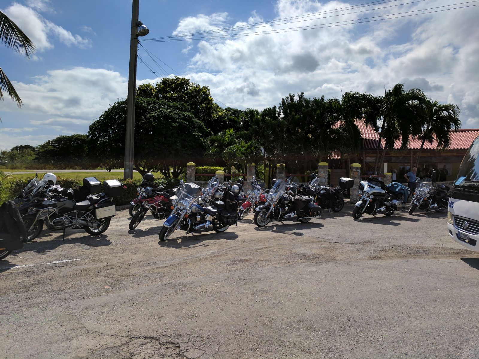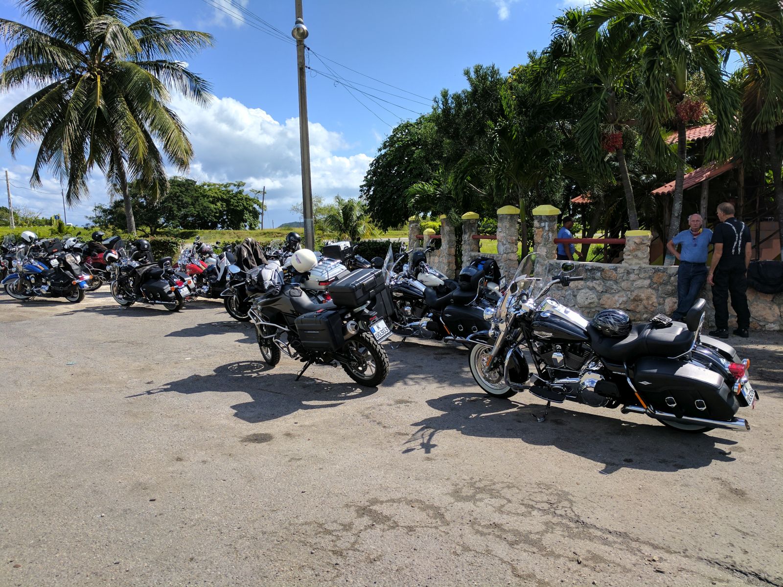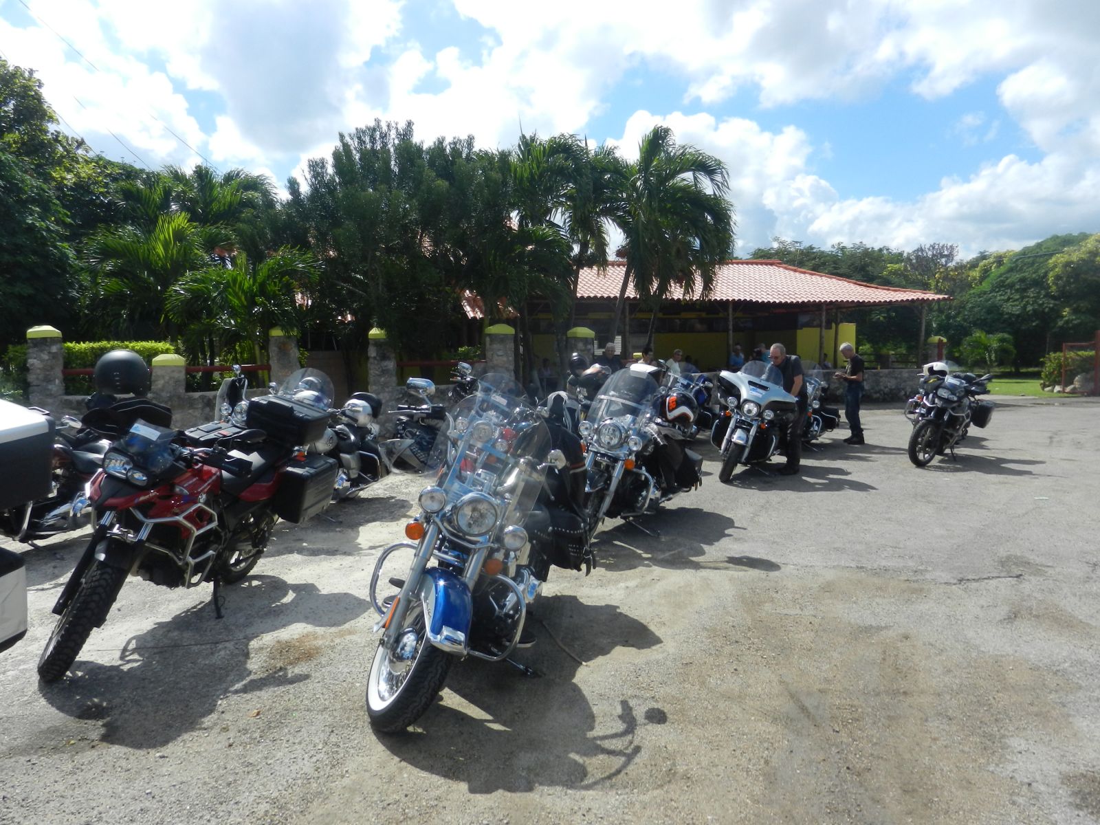 Nachdem wir alle Formalitäten und Probefahrten erledigt hatten, starteten wir im Konvoi von 19 Bikes zu unserer Rundreise. Zuerst führte uns Hanival (aka Hannibal), der Tourguide vom Vermieter, durch die Vororte auf den Malecón zurück. Vorbei an der CH-, US-Botschaft und unserem Hotel näherten wir uns der Altstadt. Für einmal waren nicht die farbigen Oldtimer die Attraktion in der Altstadt, sondern unsere dröhnenden Maschinen. Überall standen die Leute, winkten und fotografierten.
