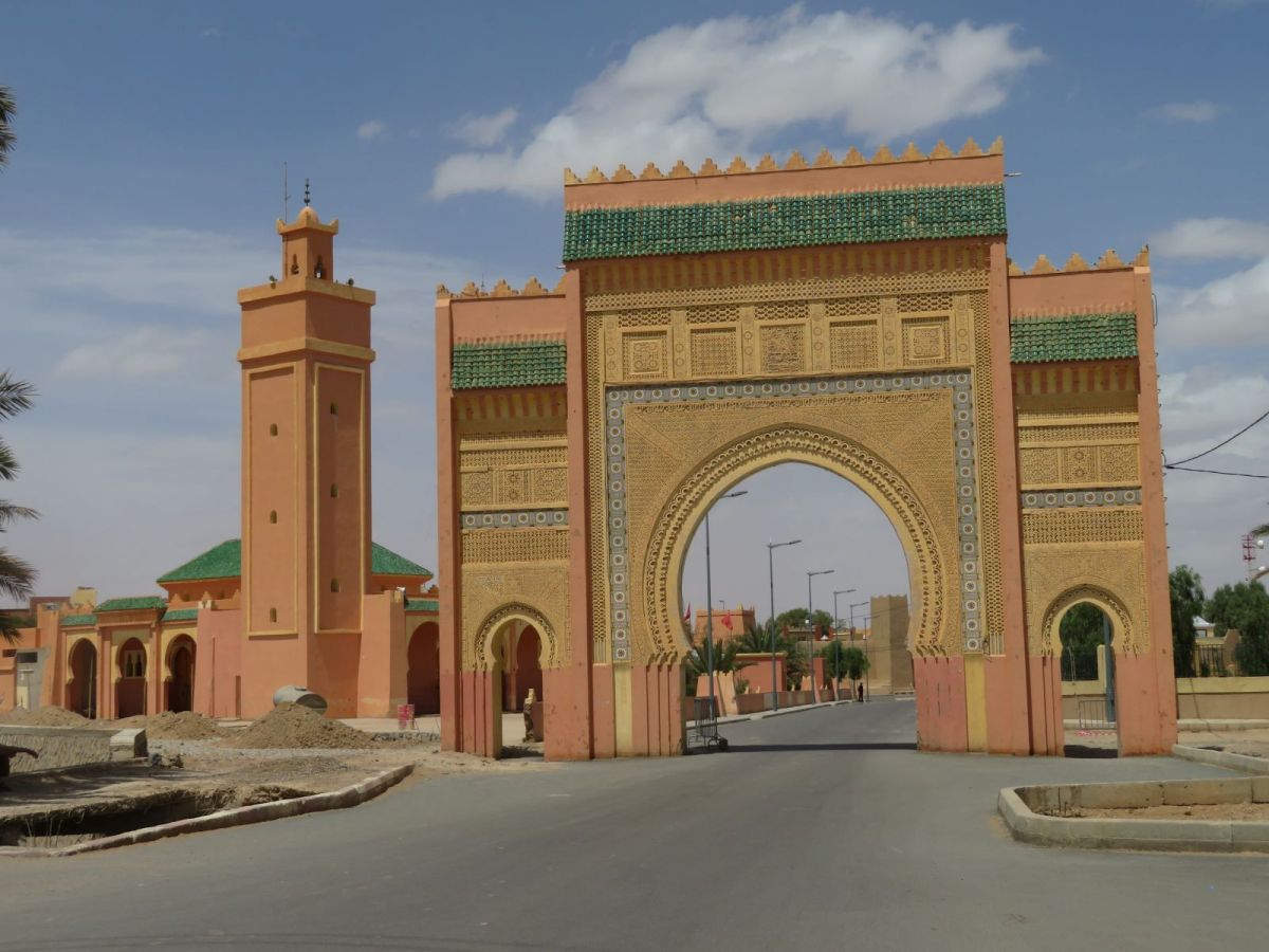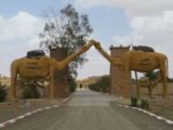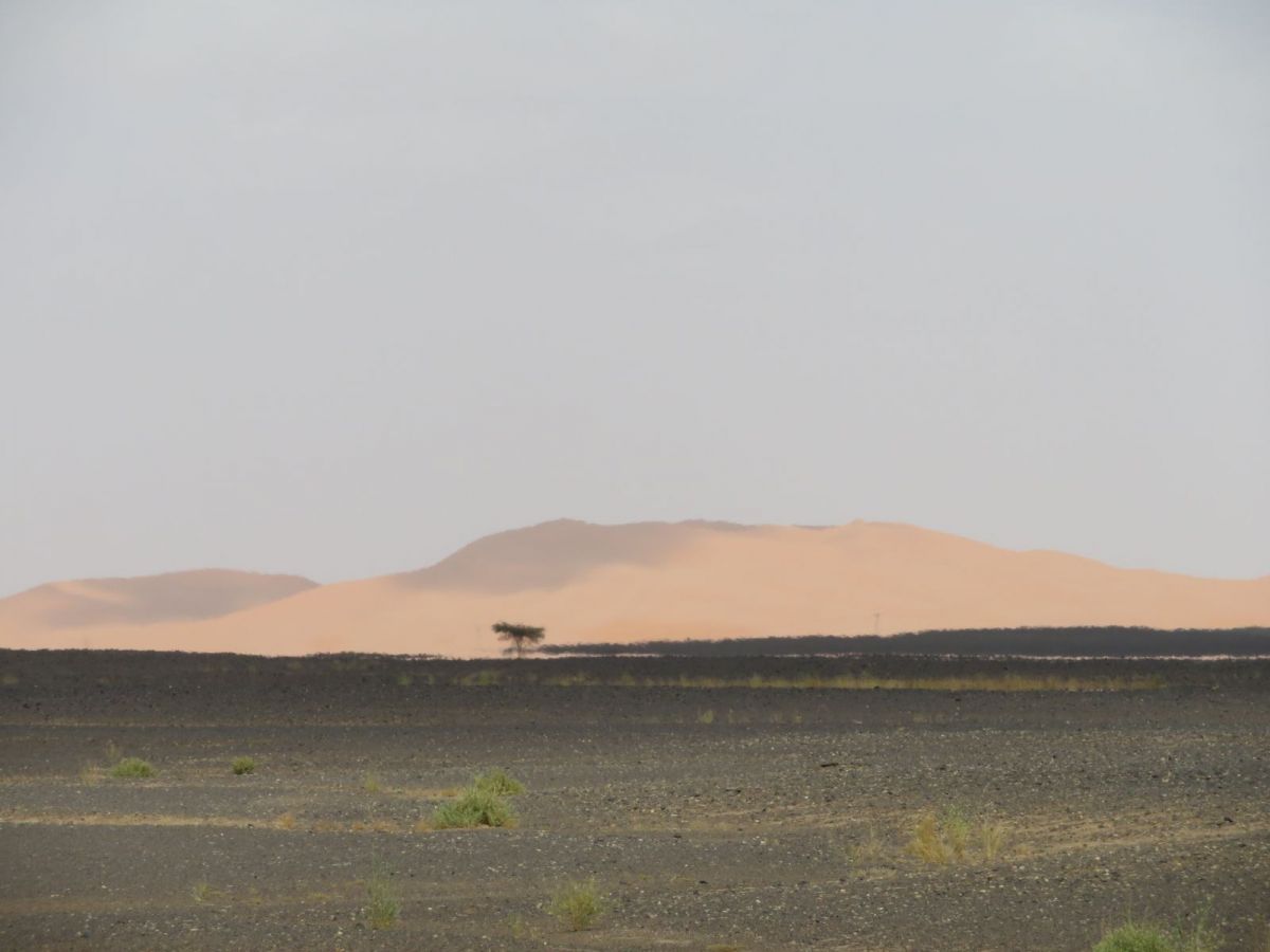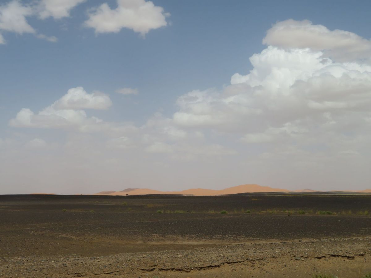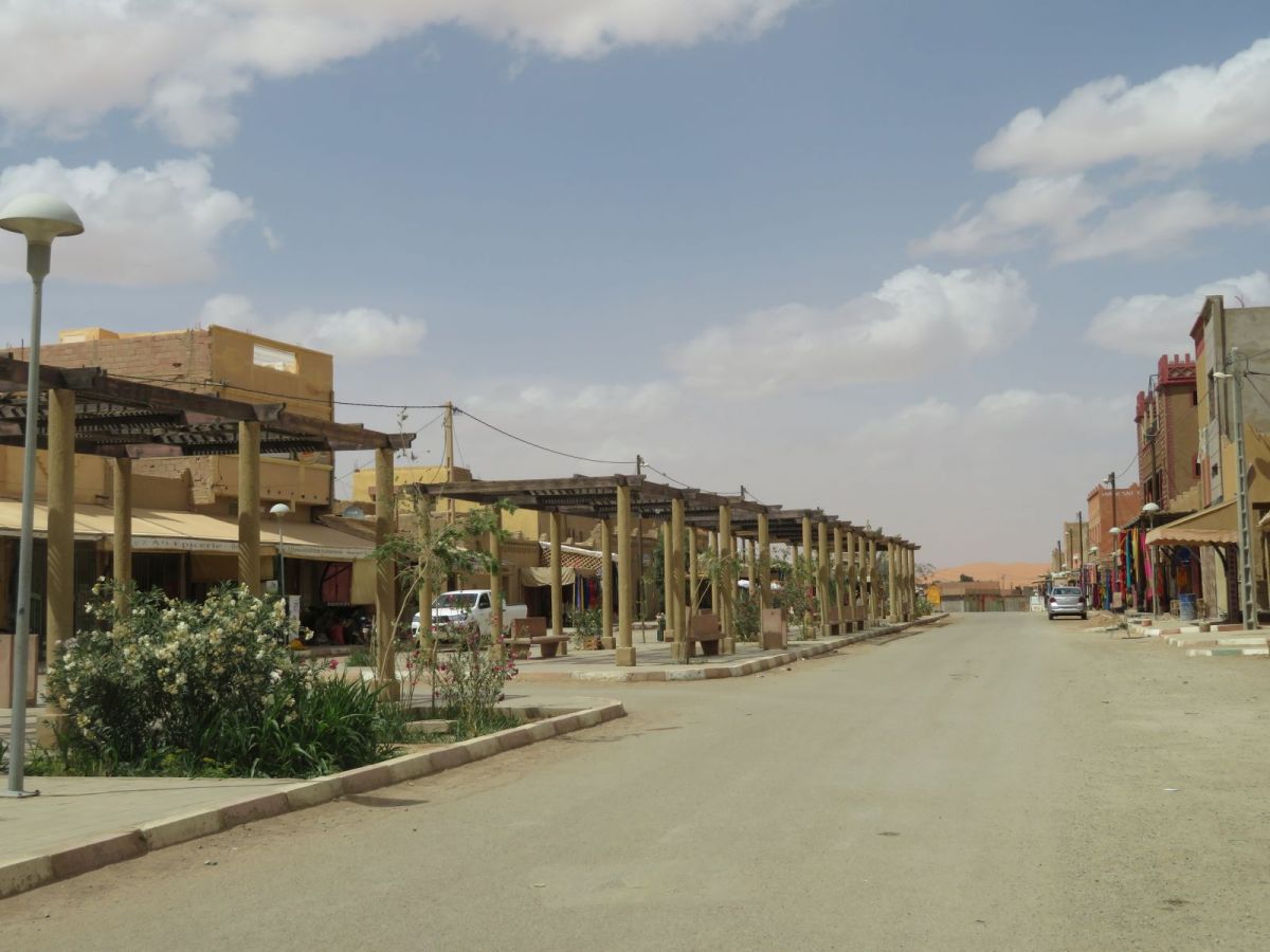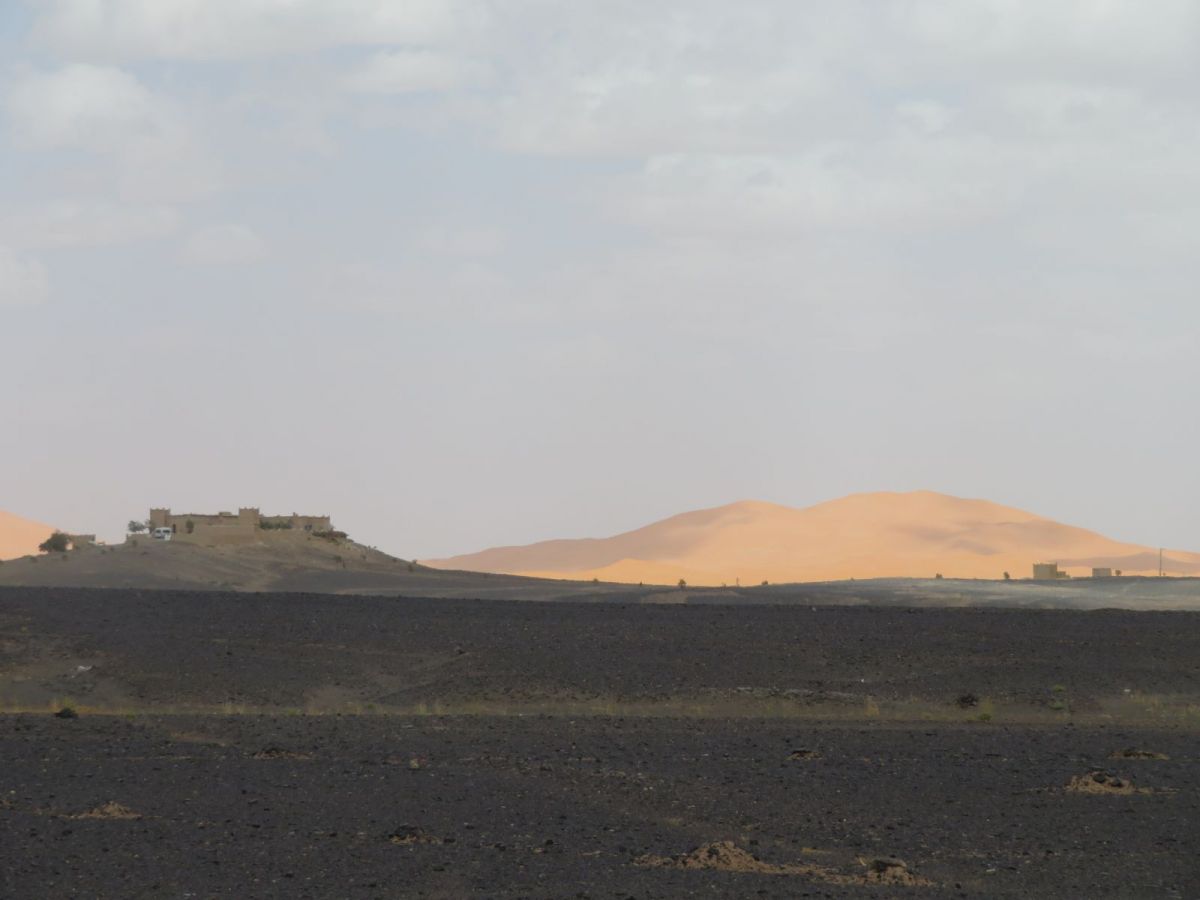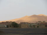 Nach dem Besuch der Schlucht fuhren wir weiter wieder in die WEüste hinein zu unserem nächsten Tagesziel, den Erg Chebbi Sanddünen bei Merzouga. Schon von weitem begrüssten uns die Dünen und wir fuhren zuerst direkt nach Merzouga. Hier war es Dank des Ramadan wie ausgestorben, nur ein paar 'faux guides' wollten uns Kamel- und andere Touren in die Dünen aufschwatzen.