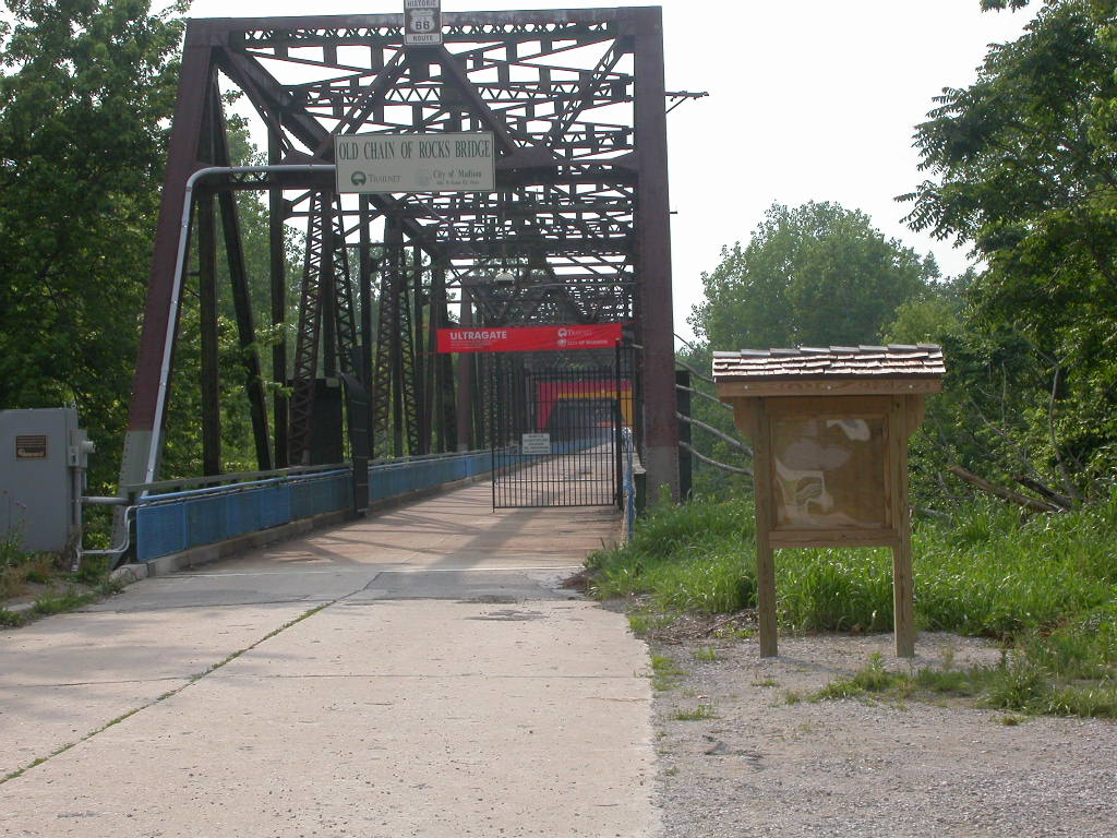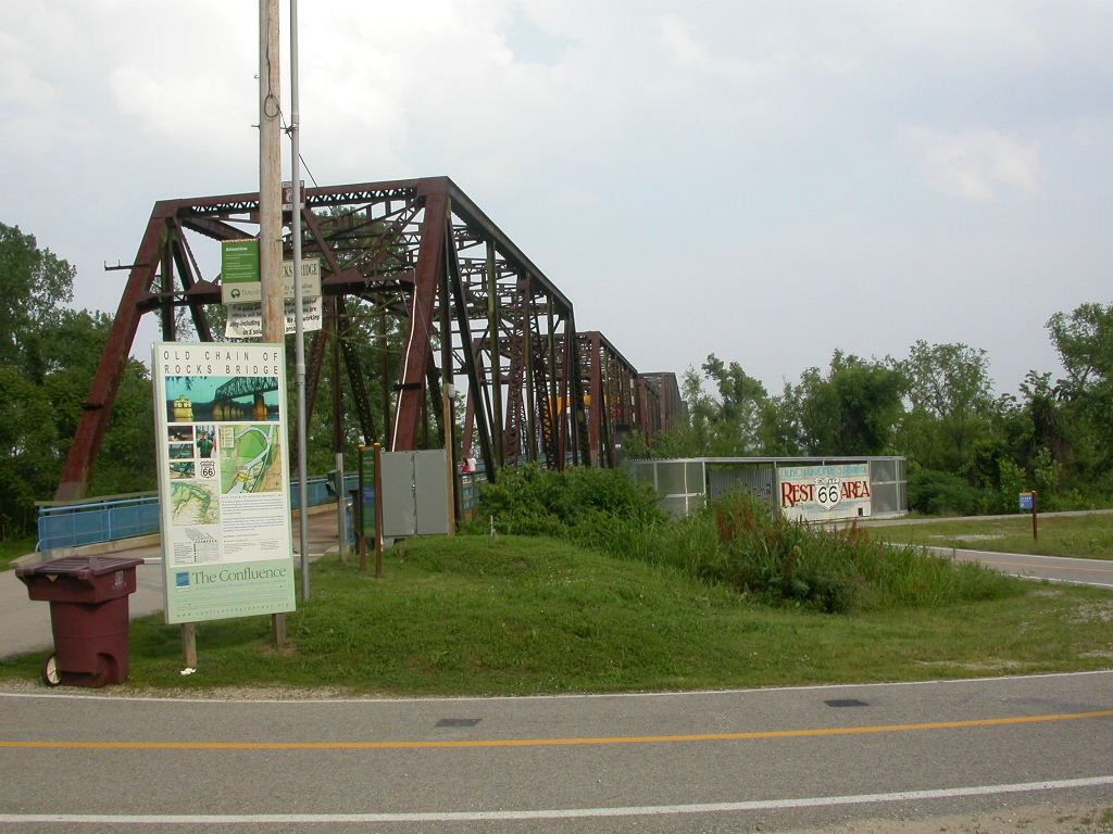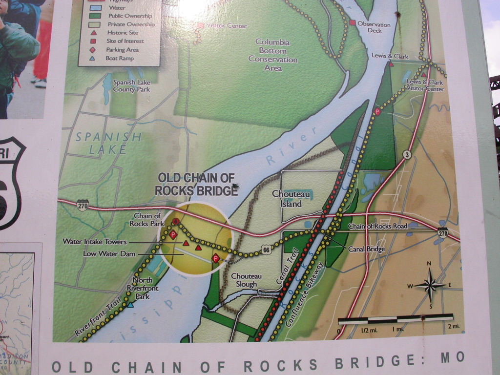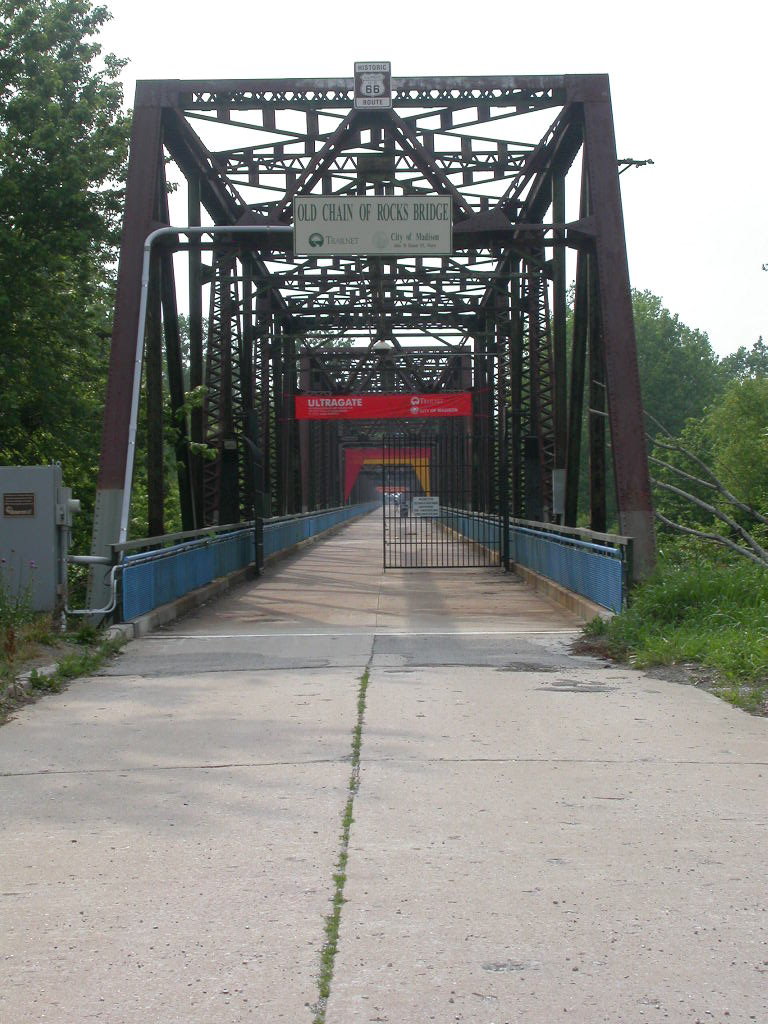 Früher überquerte die '66' den Mississippi unter Anderem auch über die "Chain of Rocks Bridge". Doch für den heutigen Schwerverkehr ist sie wohl zu wenig tragfähig und ausserdem viel zu schmal. So dürfen 'offiziel' nur noch Füssgänger und Fahrräder die Brücke benutzen...