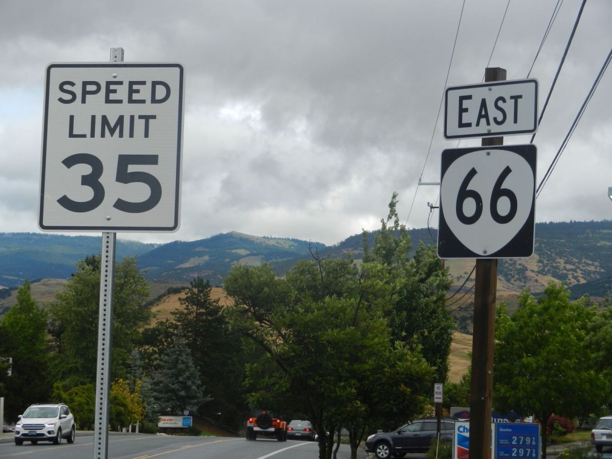 Ab ging es auf die Route 66, aber die in Oregon, die quer durch das Cascade-Siskiyou National Monument nach Klamath Falls führt. Leider begann es wieder zu schütten und ich war für einmal froh über die gelben Doppellinien auf der Strasse. Bei Regen und Nebel sieht man mit nasser Brille, Helmvisier und Frontscheibe nicht mehr allzu viel und ich schlich mich entlang dieser Linien gegen Klamath Falls.