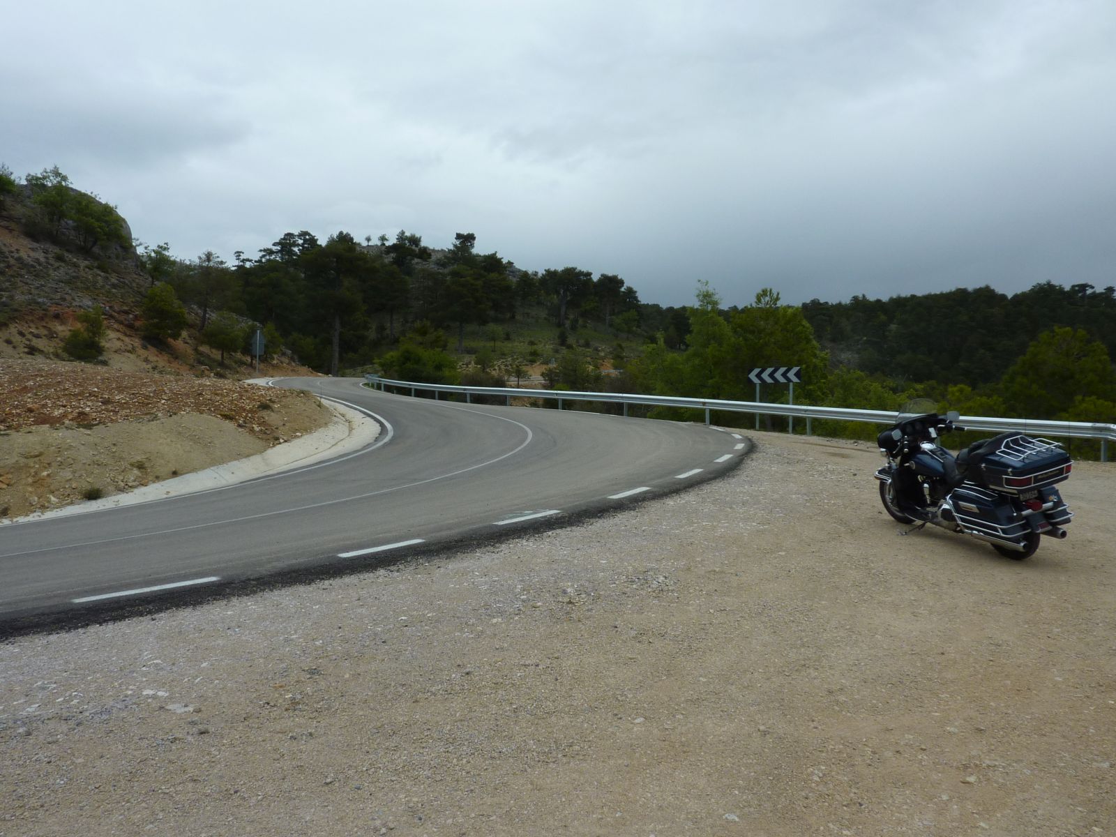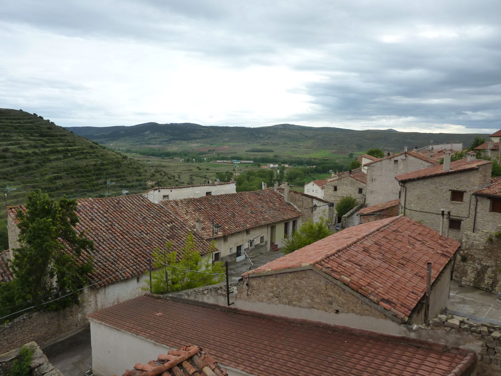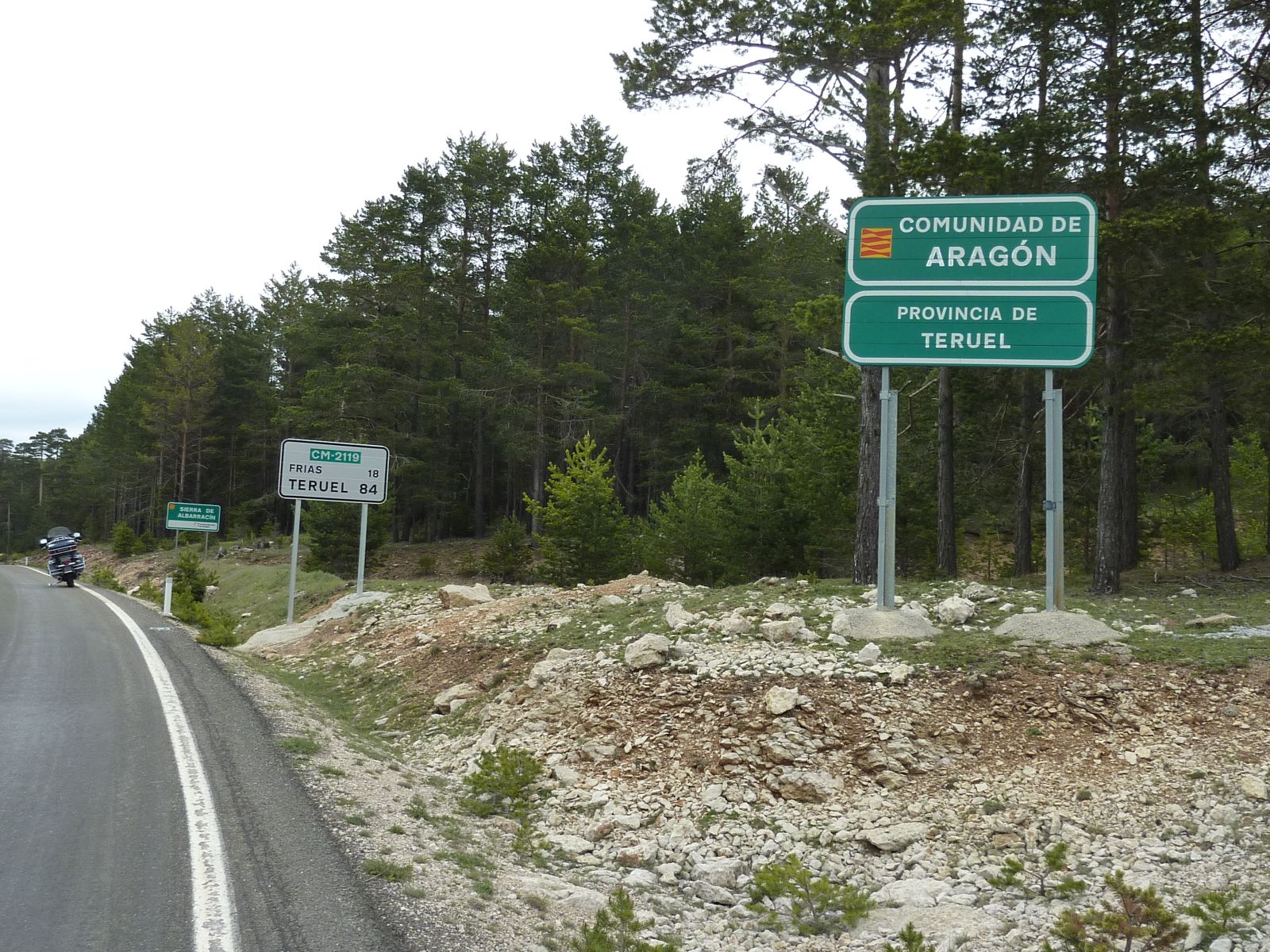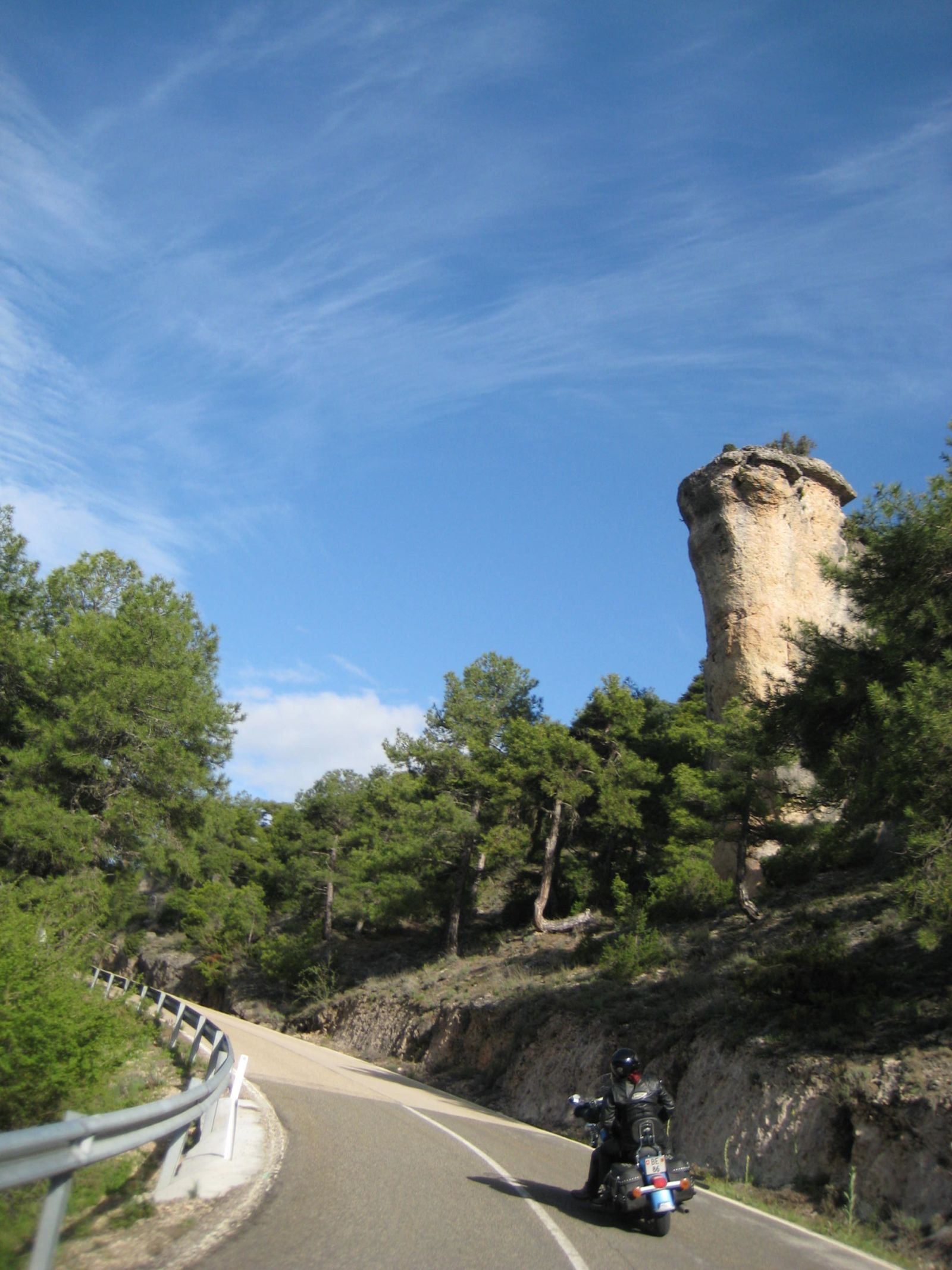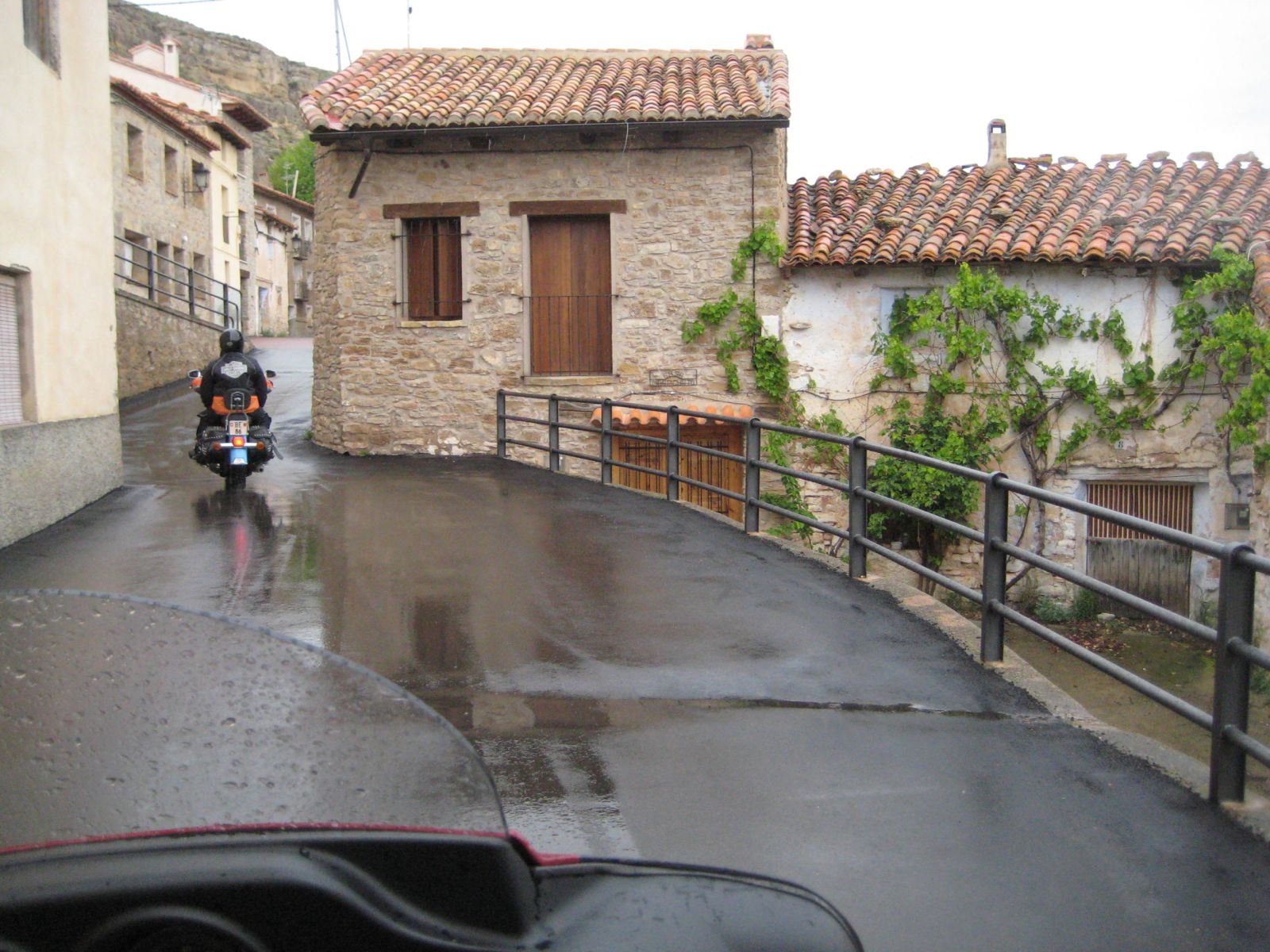 Auf der Fahrt zur 'verzauberten Stadt' wurde der Himmel bedenklich dunkler und bei der Kreuzung wo wir die Route Richtung Una und Teruel hätten verlassen müssen, entschloss ich mich die Stadt rechts liegen zu lassen und in Erwartung des Regens noch viele trockene Kilometer zurückzulegen. Doch der regen war schneller, bereits wenige Kilometer später in Una durften wir die Regenkleidung anziehen und mussten sie an behalten bis ins Hotel 'Palacio de Allepuz'. Da wir alles abseits der vielbefahrenen Routen gefahren sind, wurde es für Edith's Virago langsam knapp mit Benzin. Doch trotz der paar Zusatzkilometer nach Tragacete, um vor einer geschlossenen Tankstelle zu stehen, reichte es die Fahrt über den Puerto de El Cubillo und die Montes Universales bis nach Albarracin fortzusetzen. Hier konnten wir alle Auftanke und einer Nonstop Regenfahrt stand nun nichts mehr im Wege.