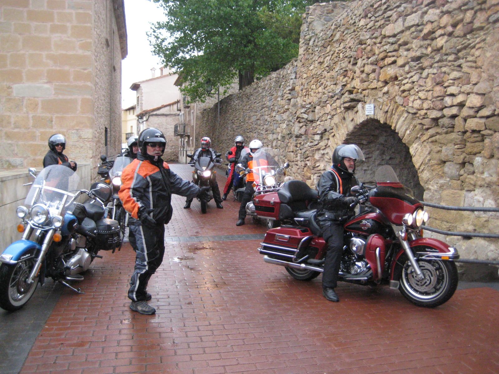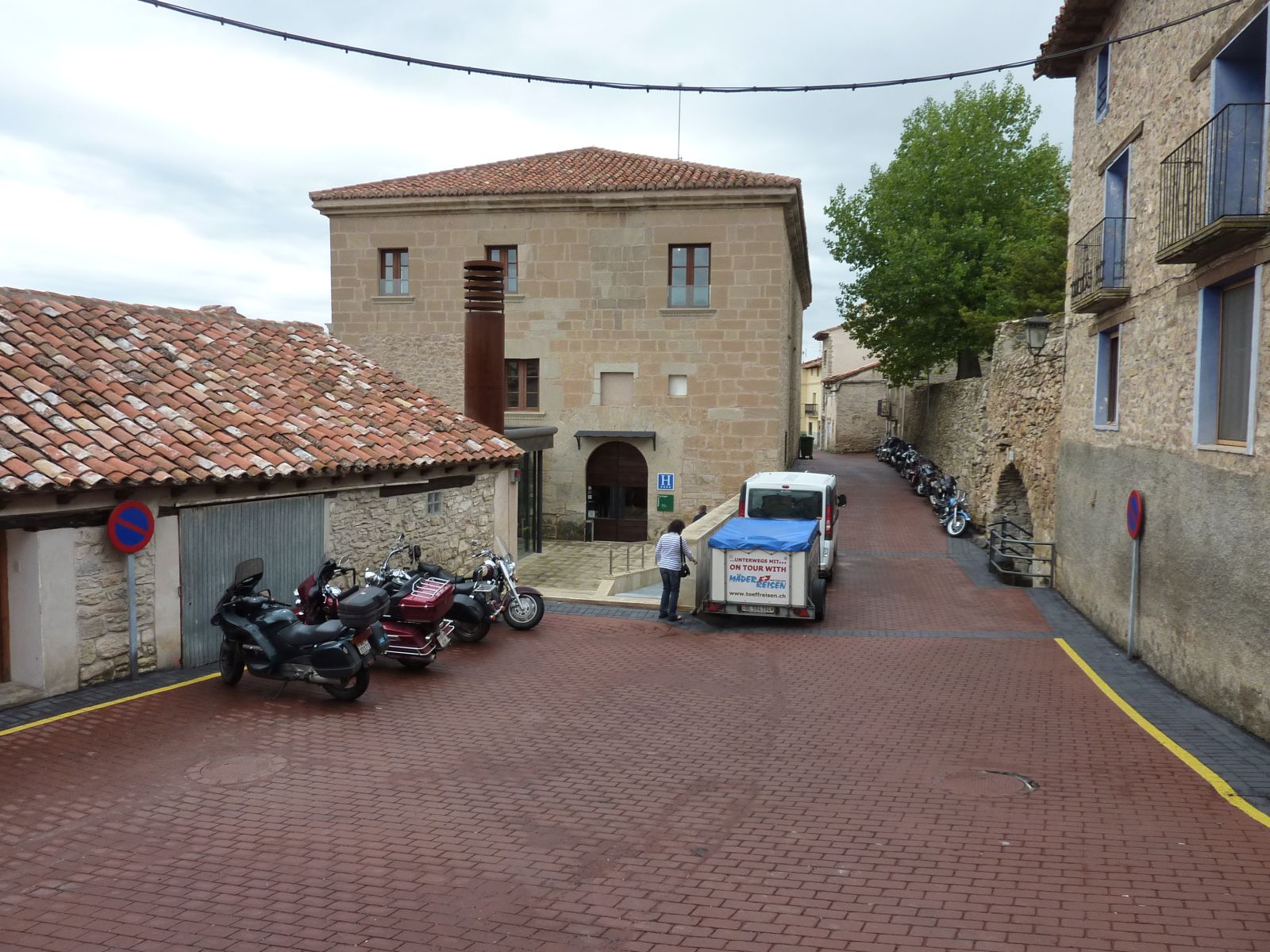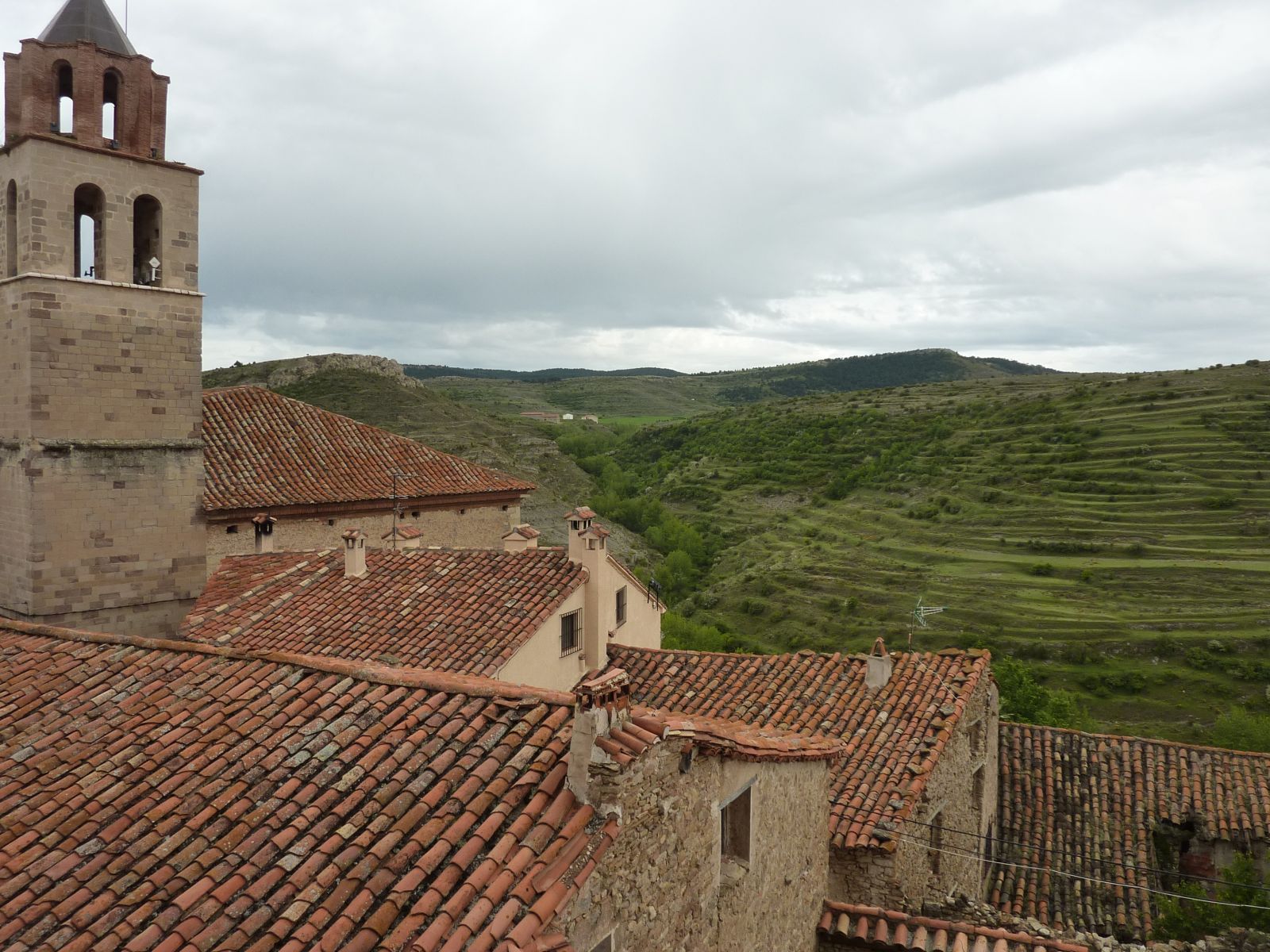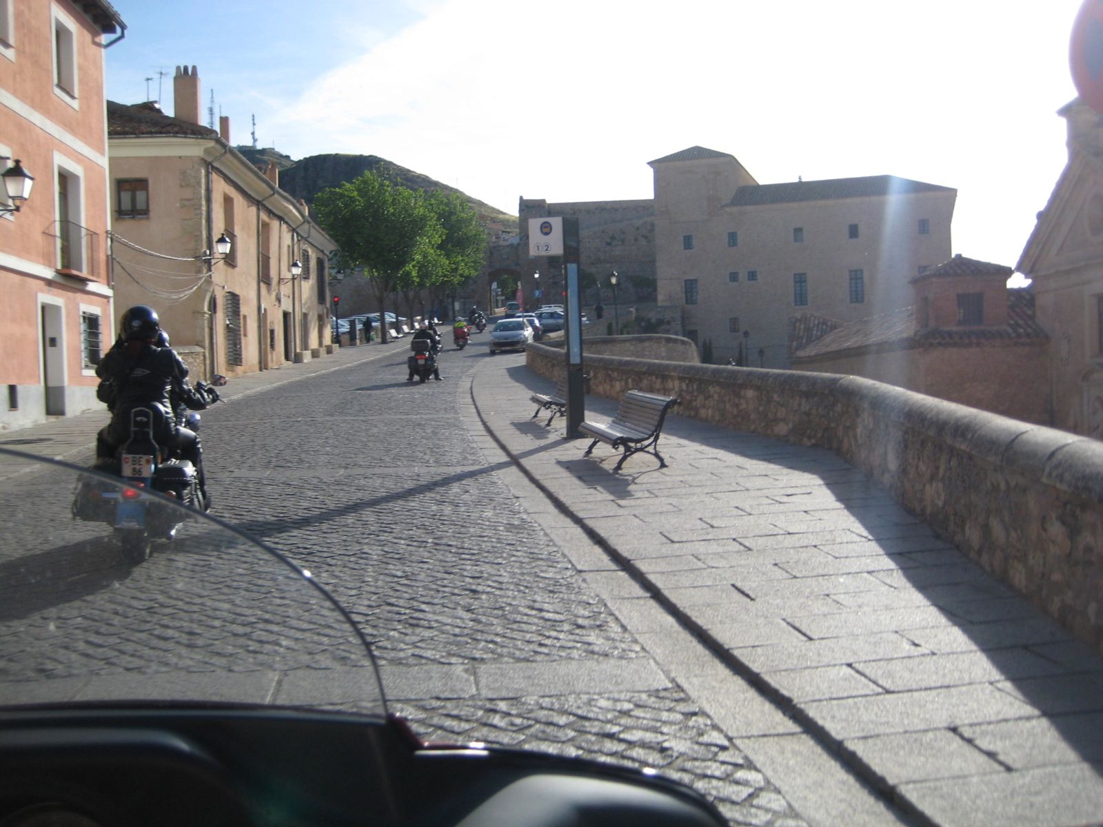 Auf der Fahrt zur 'verzauberten Stadt' wurde der Himmel bedenklich dunkler und bei der Kreuzung wo wir die Route Richtung Una und Teruel hätten verlassen müssen, entschloss ich mich die Stadt rechts liegen zu lassen und in Erwartung des Regens noch viele trockene Kilometer zurückzulegen. Doch der regen war schneller, bereits wenige Kilometer später in Una durften wir die Regenkleidung anziehen und mussten sie an behalten bis ins Hotel 'Palacio de Allepuz'. Da wir alles abseits der vielbefahrenen Routen gefahren sind, wurde es für Edith's Virago langsam knapp mit Benzin. Doch trotz der paar Zusatzkilometer nach Tragacete, um vor einer geschlossenen Tankstelle zu stehen, reichte es die Fahrt über den Puerto de El Cubillo und die Montes Universales bis nach Albarracin fortzusetzen. Hier konnten wir alle Auftanke und einer Nonstop Regenfahrt stand nun nichts mehr im Wege.