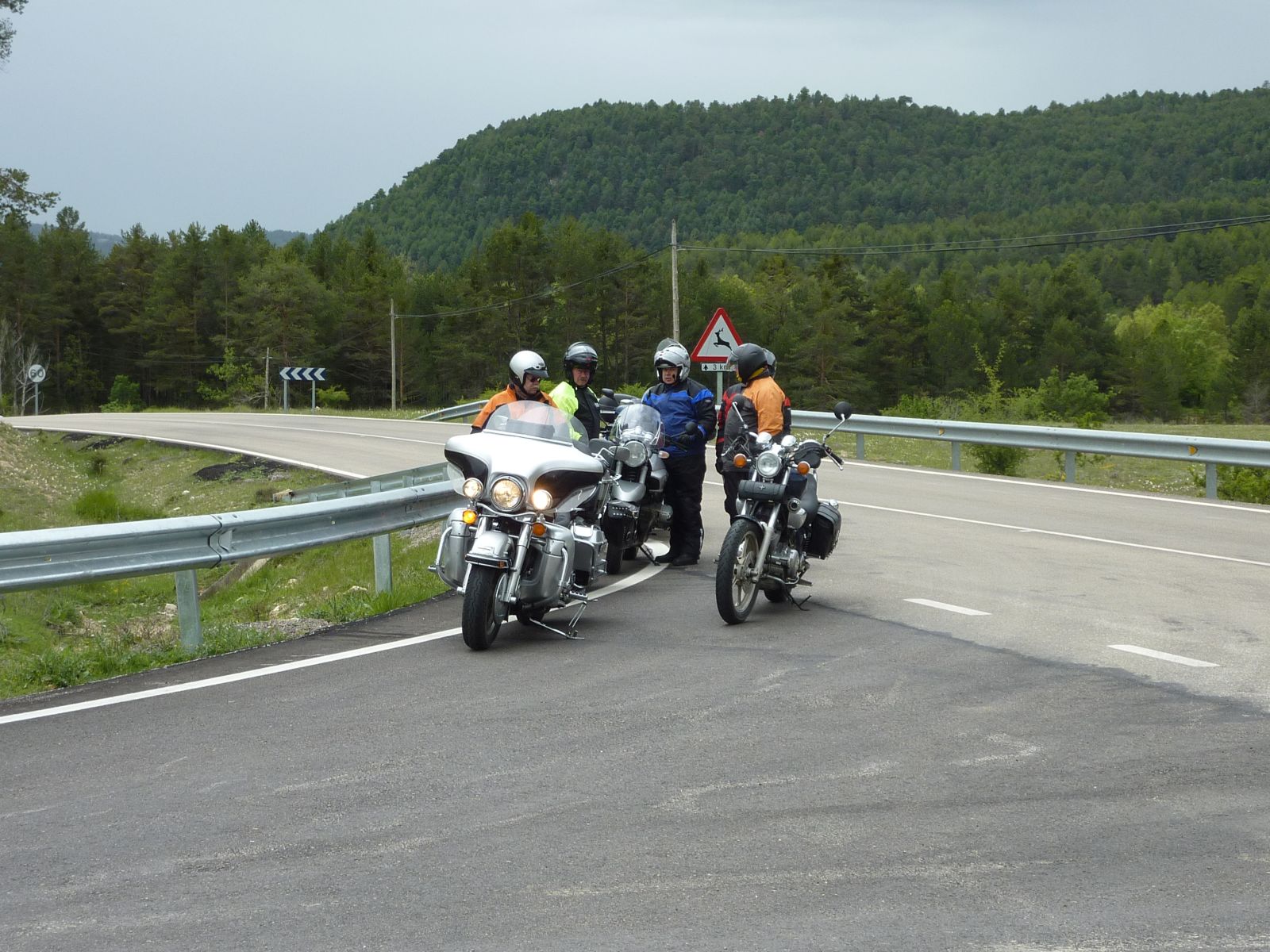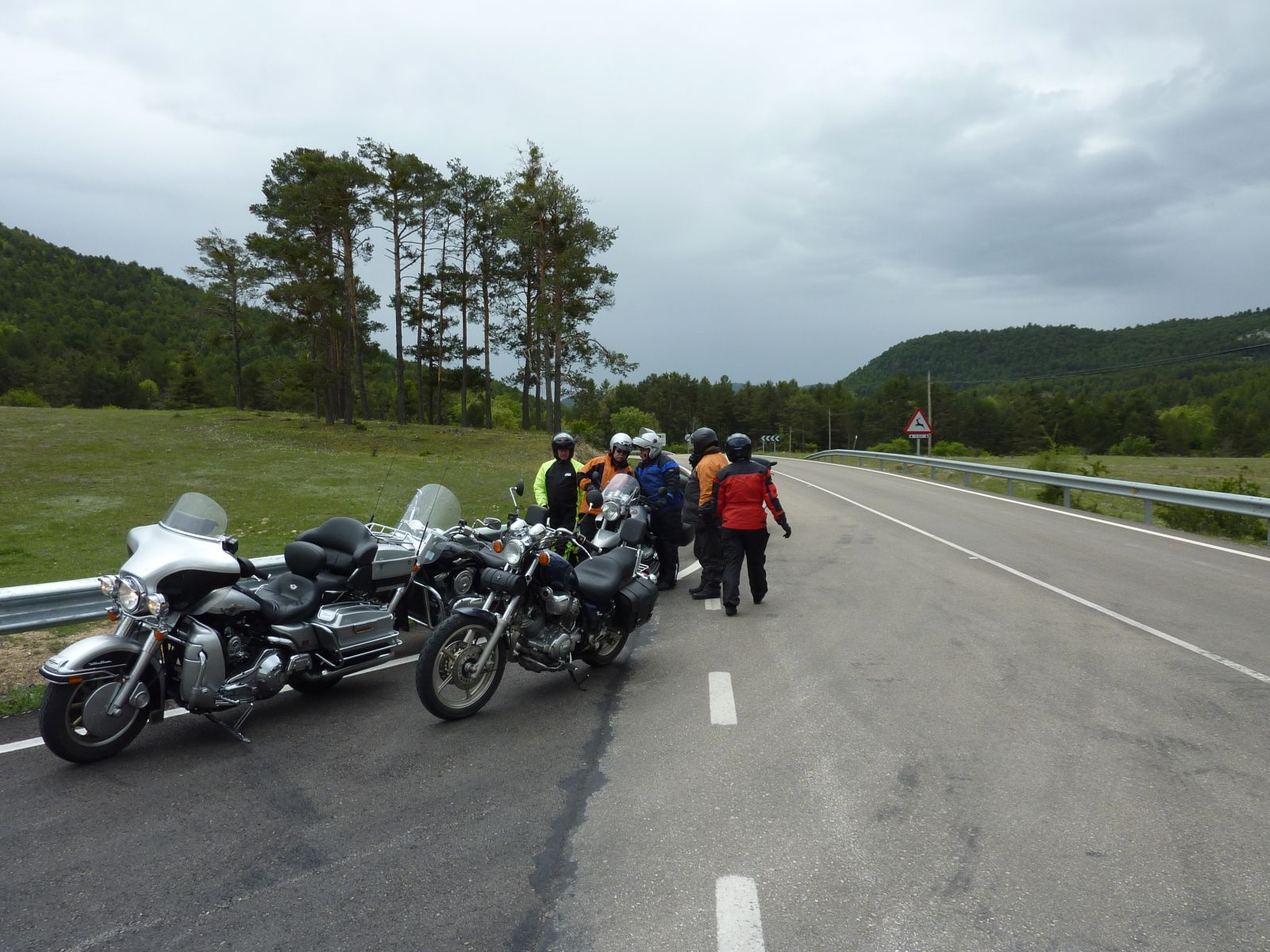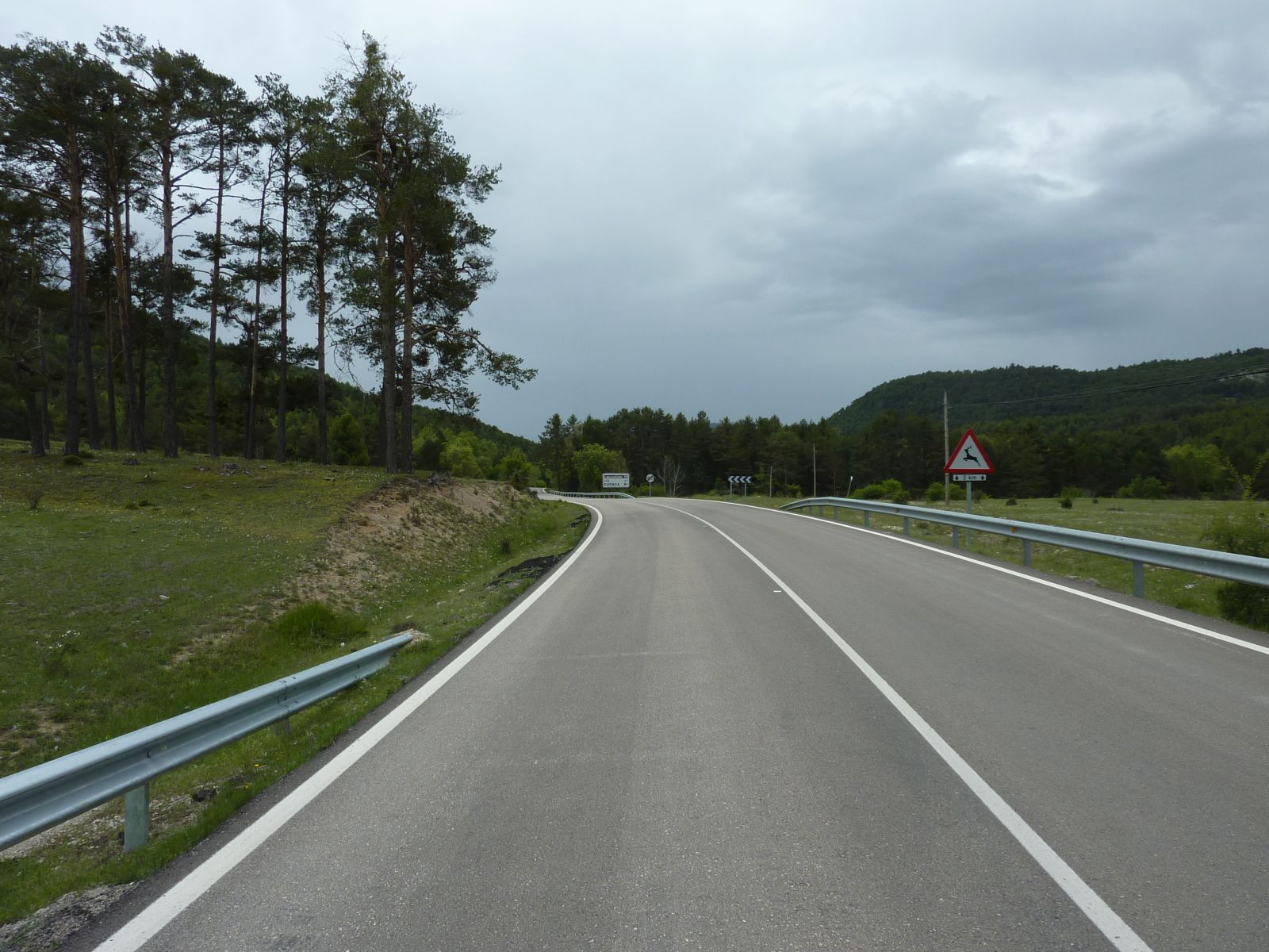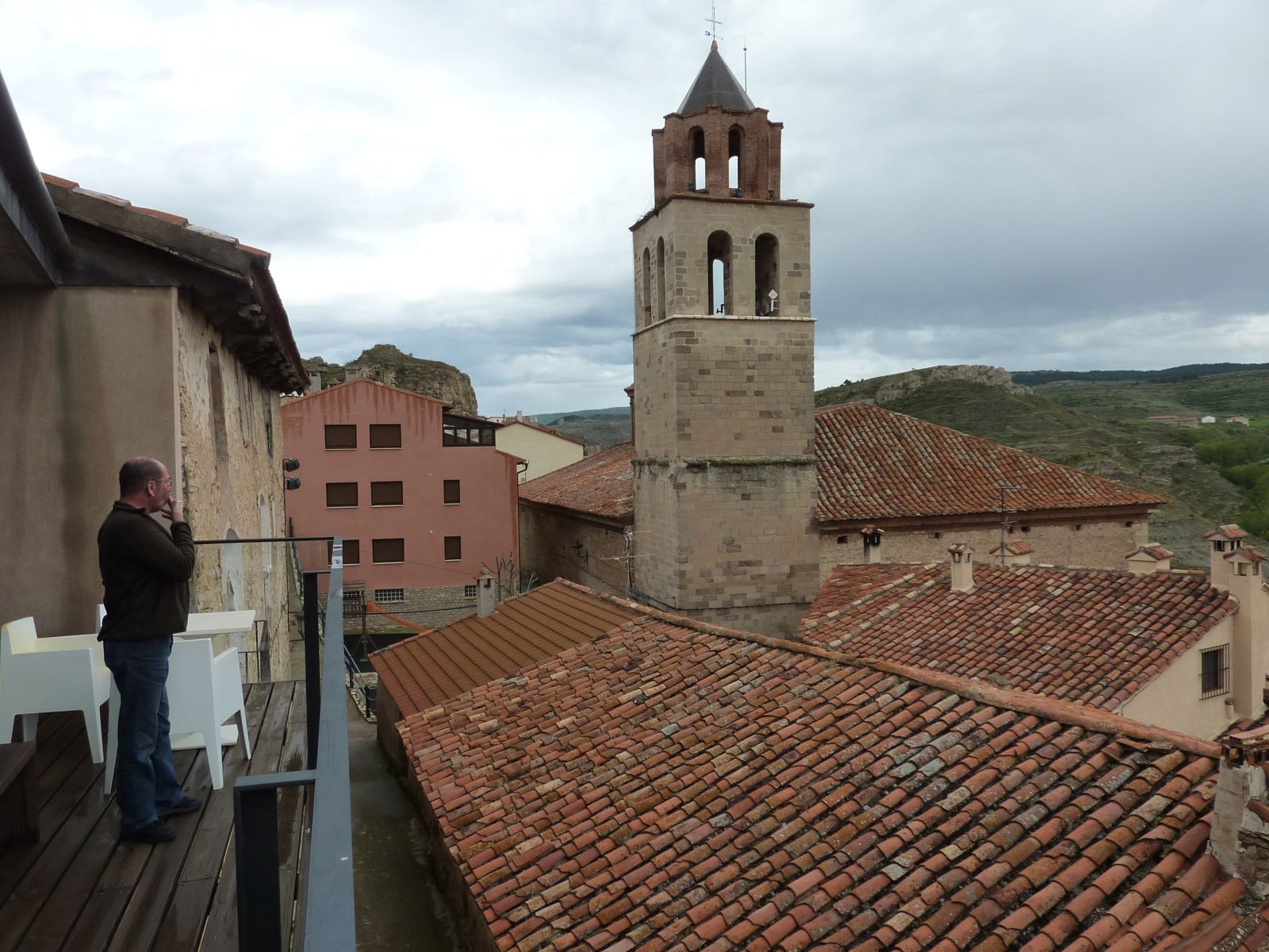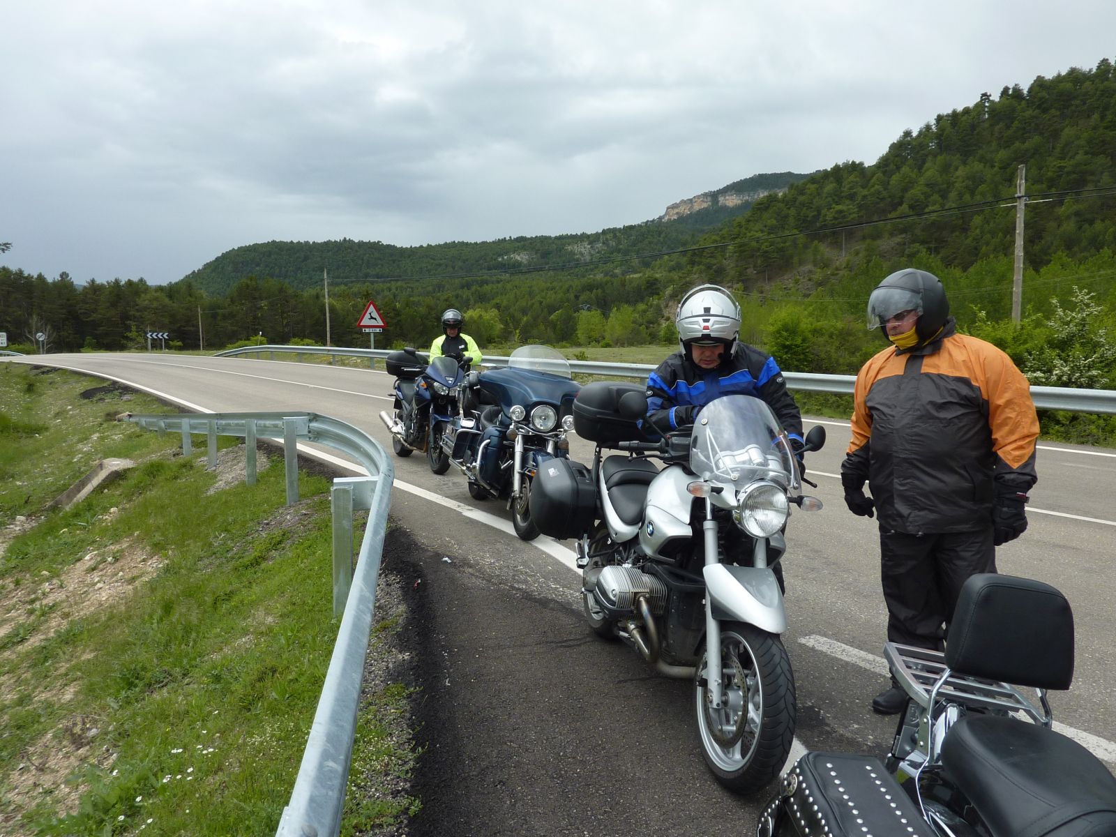 Auf der Fahrt zur 'verzauberten Stadt' wurde der Himmel bedenklich dunkler und bei der Kreuzung wo wir die Route Richtung Una und Teruel hätten verlassen müssen, entschloss ich mich die Stadt rechts liegen zu lassen und in Erwartung des Regens noch viele trockene Kilometer zurückzulegen. Doch der regen war schneller, bereits wenige Kilometer später in Una durften wir die Regenkleidung anziehen und mussten sie an behalten bis ins Hotel 'Palacio de Allepuz'. Da wir alles abseits der vielbefahrenen Routen gefahren sind, wurde es für Edith's Virago langsam knapp mit Benzin. Doch trotz der paar Zusatzkilometer nach Tragacete, um vor einer geschlossenen Tankstelle zu stehen, reichte es die Fahrt über den Puerto de El Cubillo und die Montes Universales bis nach Albarracin fortzusetzen. Hier konnten wir alle Auftanke und einer Nonstop Regenfahrt stand nun nichts mehr im Wege.