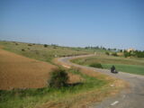 Während dem Essen wurde es immer grauer und schwärzer gegen Osten wo wir eigentlich hin wollten, so dass ich eine Alternative südwärts suchte um dort dann auf die Autobahn Madrid - Oropesa zu gelangen. Das Navi hatte da sehr rasch eine Route zusammen und wir fuhren los. Zuerst ging die asphaltierte Strasse in eine gute Naturstrasse über, doch dann, bei einer Kreuzung stieg der Weg an und glich schon bald einem ausgewaschenen Bachbett. Da hiess es für mich mit der E-Glide nur noch Gas geben und hochfahren. Als der Weg dann wieder flacher wurde konnte ich anhalten und auf die Andern warten. Lange kam niemand, doch dann kam Albert alleine und kurz später auch Stefan. Dieser meldete, dass Edith, Heinz und Markus nicht kämen und bei der Kreuzung warteten bis jemand von uns zurück kommt.